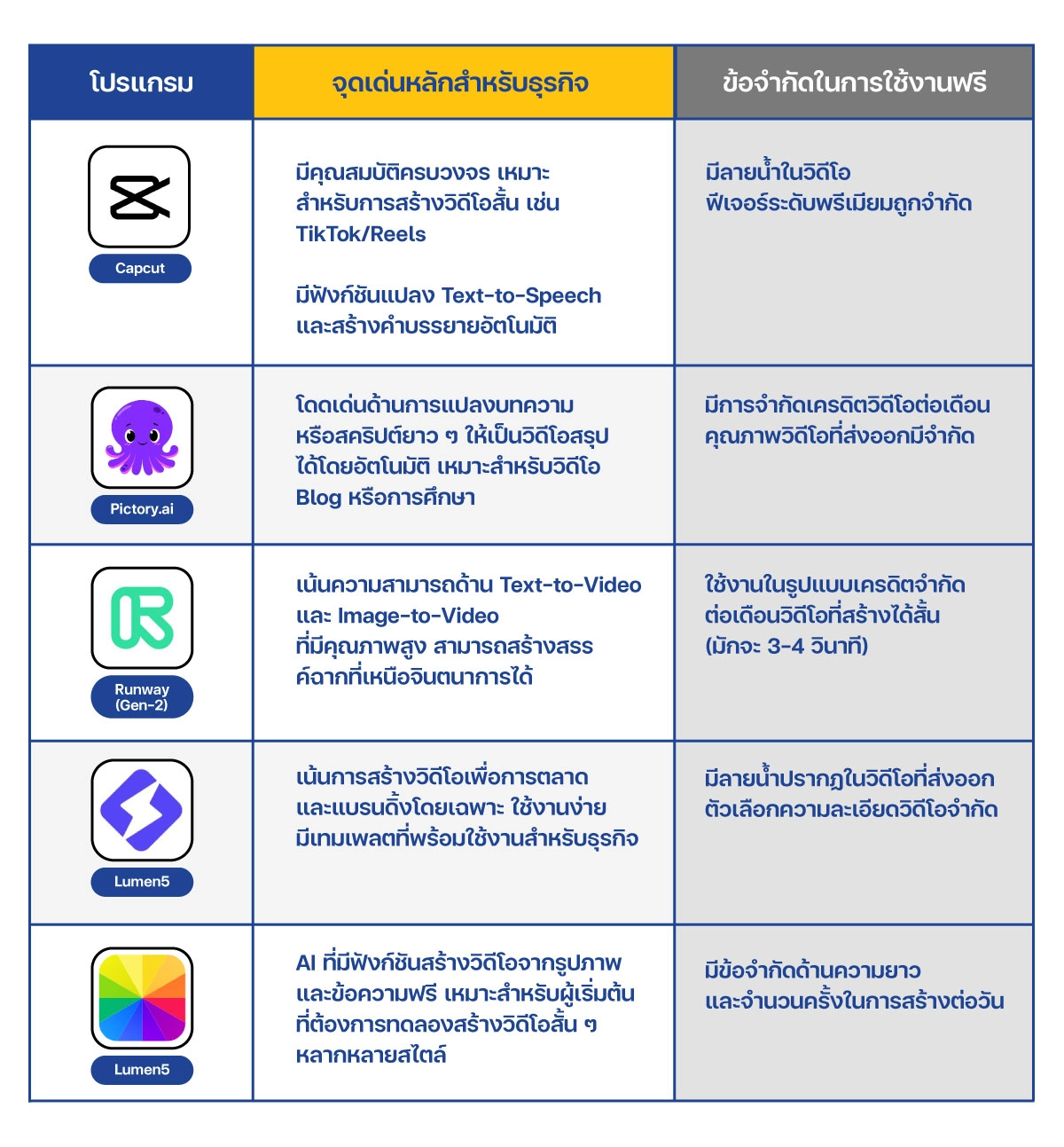 จากตารางข้างต้น แนะนำให้เจ้าของธุรกิจเริ่มต้นจากโปรแกรมที่ใช้งานง่าย และมีฟีเจอร์ครบวงจรอย่าง CapCut หรือ Lumen5 ก่อน เพื่อเรียนรู้การทำงานของ AI สร้างวิดีโอในเบื้องต้น และขยับไปใช้เครื่องมือที่มีความซับซ้อนอย่าง Runway เมื่อต้องการความสร้างสรรค์ที่มากขึ้น