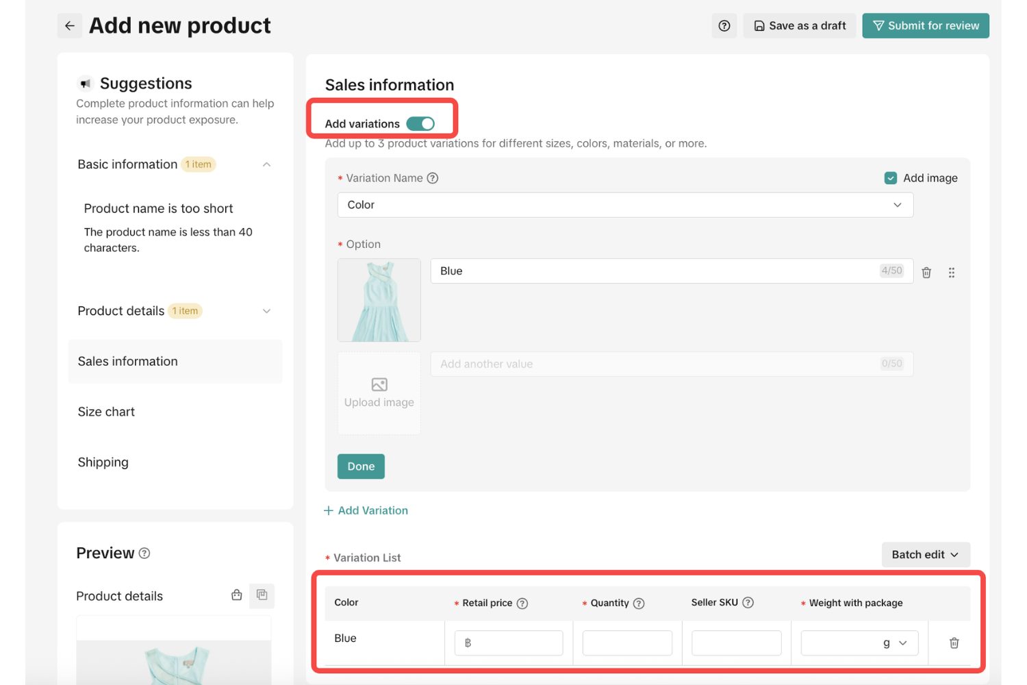 หากสินค้าของคุณมีหลายสี หลายไซส์ ให้เลือกเมนู “เปิดใช้งานตัวเลือกสินค้า” เพื่อกำหนดราคาและจำนวนสต๊อกแยกตามแต่ละรายการ (SKU) สิ่งนี้จะช่วยลดปัญหาสต๊อกจม หรือการขายของเกินจำนวนจริงจนออเดอร์ตกหล่น หากคุณใช้ระบบจัดการสต๊อกที่ดี ข้อมูลส่วนนี้จะช่วยให้การทำงานลื่นไหลขึ้นมาก