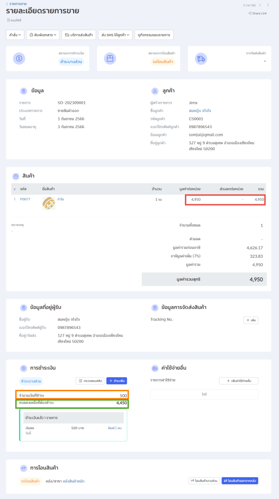 กรณีรายการขายที่มีการชำระเงินเข้ามาบางส่วน เมื่อร้านค้ากดพิมพ์เอกสารตรงหัวข้อการชำระเงินในหน้ารายละเอียดของรายการขายนั้น ๆ จะสามารถพิมพ์เอกสารได้เฉพาะยอดที่ลูกค้าชำระเงินมัดจำเข้ามา ซึ่งเอกสารจะแสดงตัวเลขของราคารายสินค้า, ส่วนลด และค่าส่ง แบบเฉลี่ยเป็นเปอร์เซ็นต์ที่เท่ากัน โดยอ้างอิงจากจำนวนเงินที่ชำระเข้ามาในรอบนั้น ๆ เท่านั้น ตามตัวอย่างดังนี้