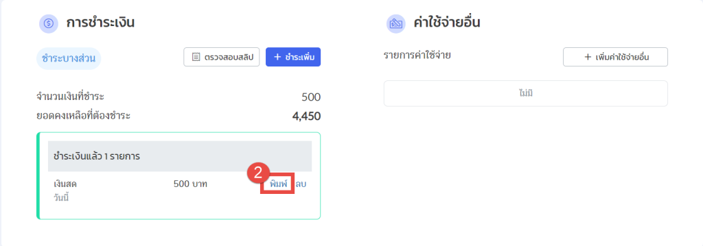 2. ไปที่การชำระเงิน คลิกปุ่ม “พิมพ์” หลังรายการชำระเงินที่ต้องการพิมพ์เอกสาร