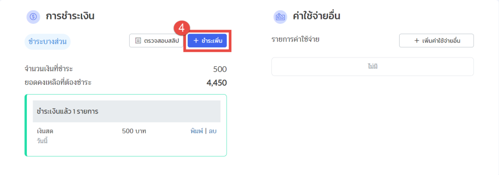 4. เมื่อครบกำหนด หรือมีการชำระเงินยอดที่เหลือ กดปุ่ม “ชำระเพิ่ม” เพื่อบันทึกชำระเงินอีกครั้ง