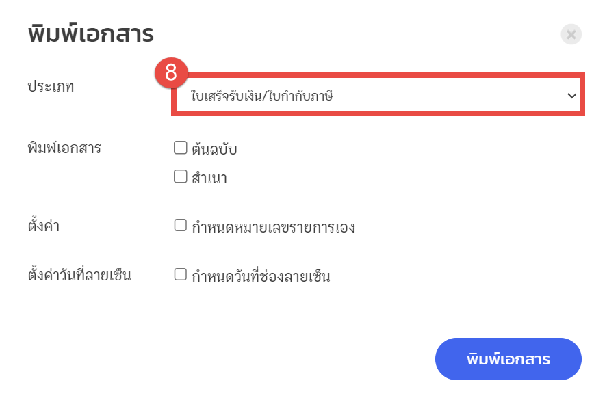 8. เลือกประเภทเอกสาร “ใบกำกับภาษี/ใบเสร็จรับเงิน” หรือ “ใบเสร็จรับเงิน”