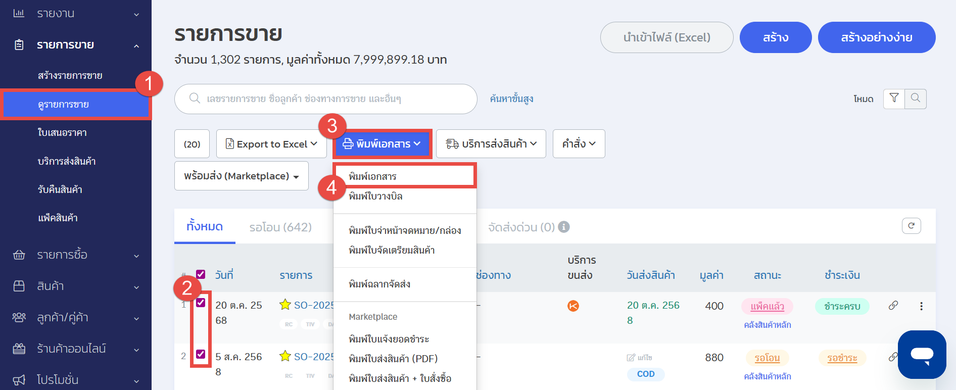 การออกเอกสารจากหน้ารายการขายช่วยให้ผู้ใช้งานจัดการออเดอร์ได้อย่างรวดเร็ว เพราะระบบสามารถดึงข้อมูลสินค้าและลูกค้าได้อัตโนมัติ ซึ่งจะช่วยลดเวลาการทำงานและลดความผิดพลาดที่อาจเกิดขึ้นได้ โดยวิธีการออกเอกสารสามารถทำได้ตามขั้นตอนต่อไปนี้