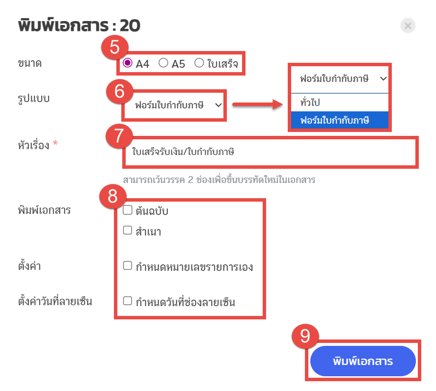 - ฟอร์มใบกำกับภาษี (จะแสดงผลเมื่อเลือกเอกสารขนาด A4)