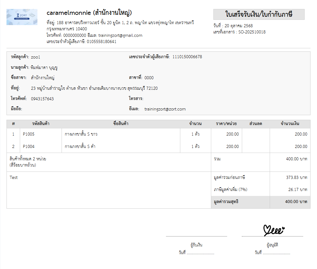 ตัวอย่างเอกสารขนาด ใบเสร็จ