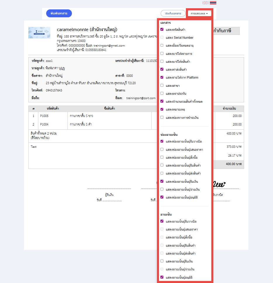 กรณีผู้ใช้งานต้องการตั้งค่าการแสดงผลในหน้าเอกสาร ให้คลิกที่ปุ่ม “แสดงผล” (ลายเซ็นผู้รับวางบิล จะแสดงข้อมูลในเมนูรายการขาย รายการซื้อ และใบเสนอราคาเท่านั้น)