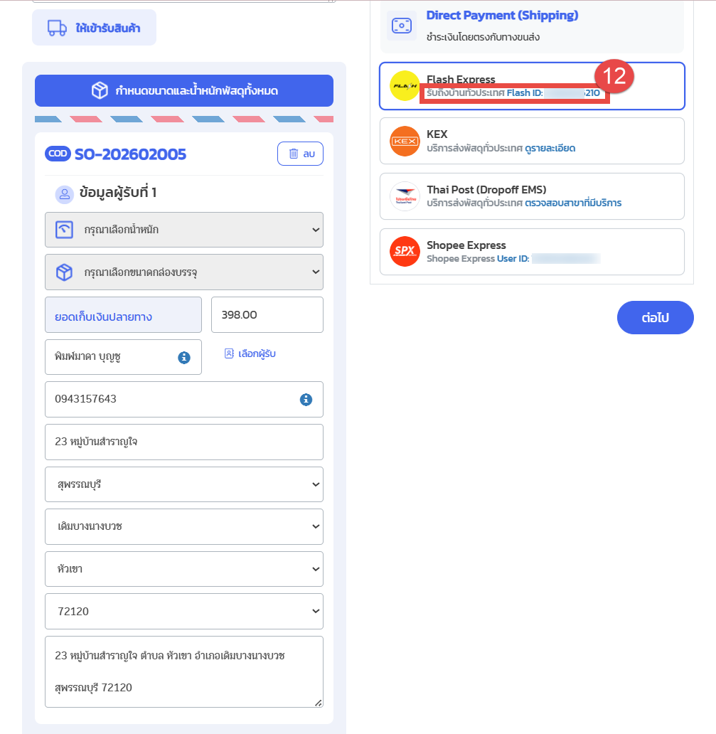 12. เมื่อกลับมายังหน้าเลือกขนส่ง และจะมีรหัส Flash ID ปรากฏใต้โลโก้ Flash Express ตามตัวอย่าง