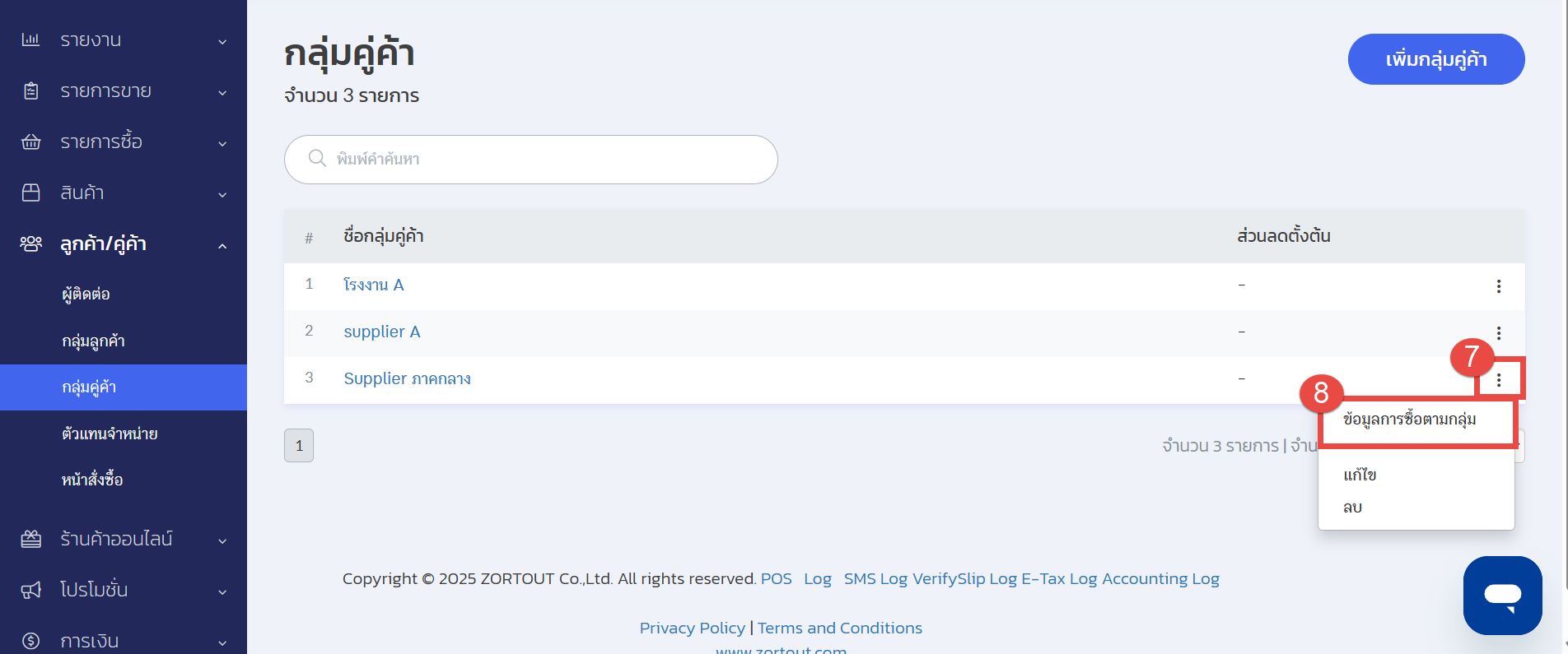 7. เมื่อร้านค้าบันทึกรายละเอียดเพิ่มผู้ติดต่อใหม่ใน “กลุ่มคู่ค้า” เรียบร้อยแล้ว ให้คลิกที่จุดสามจุดด้านหลังกลุ่มคู่ค้าดังกล่าว