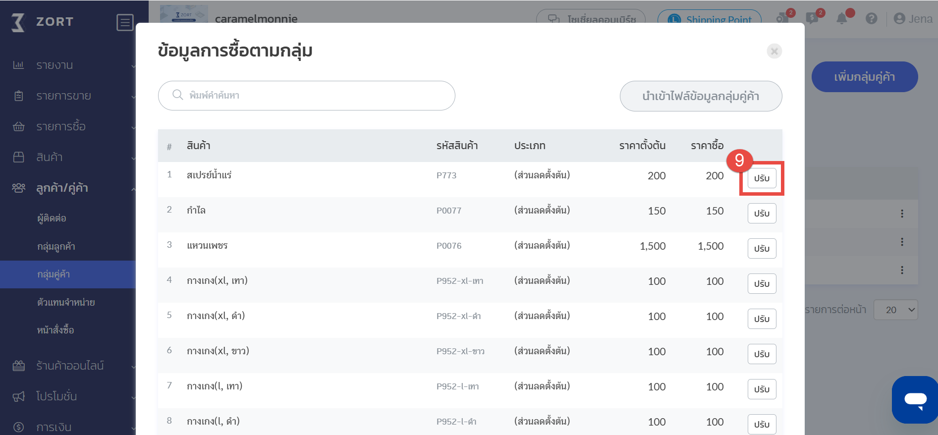 9. คลิกที่ปุ่ม “ปรับ” ด้านหลังรายการสินค้าที่ต้องการเพื่อเพิ่มรหัสสินค้า และราคาใหม่ของคู่ค้า