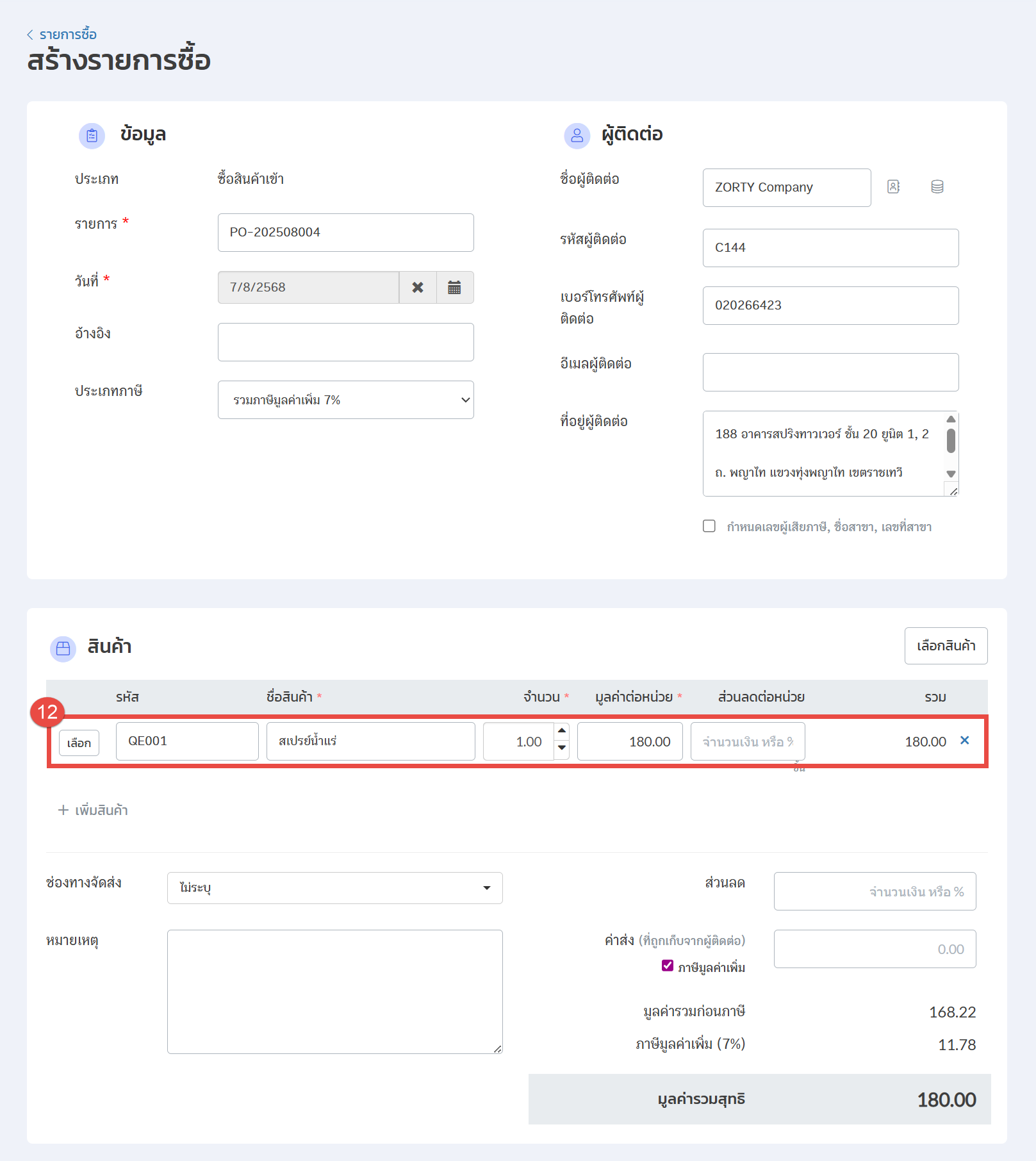 12. เมื่อร้านค้าสร้างรายการซื้อ ให้ร้านค้ากรอกรหัสสินค้าของคู่ค้าที่ตั้งค่าไว้ ระบบจะดึงข้อมูลของรหัสสินค้าและราคาสินค้าขึ้นมาให้ตามตัวอย่าง