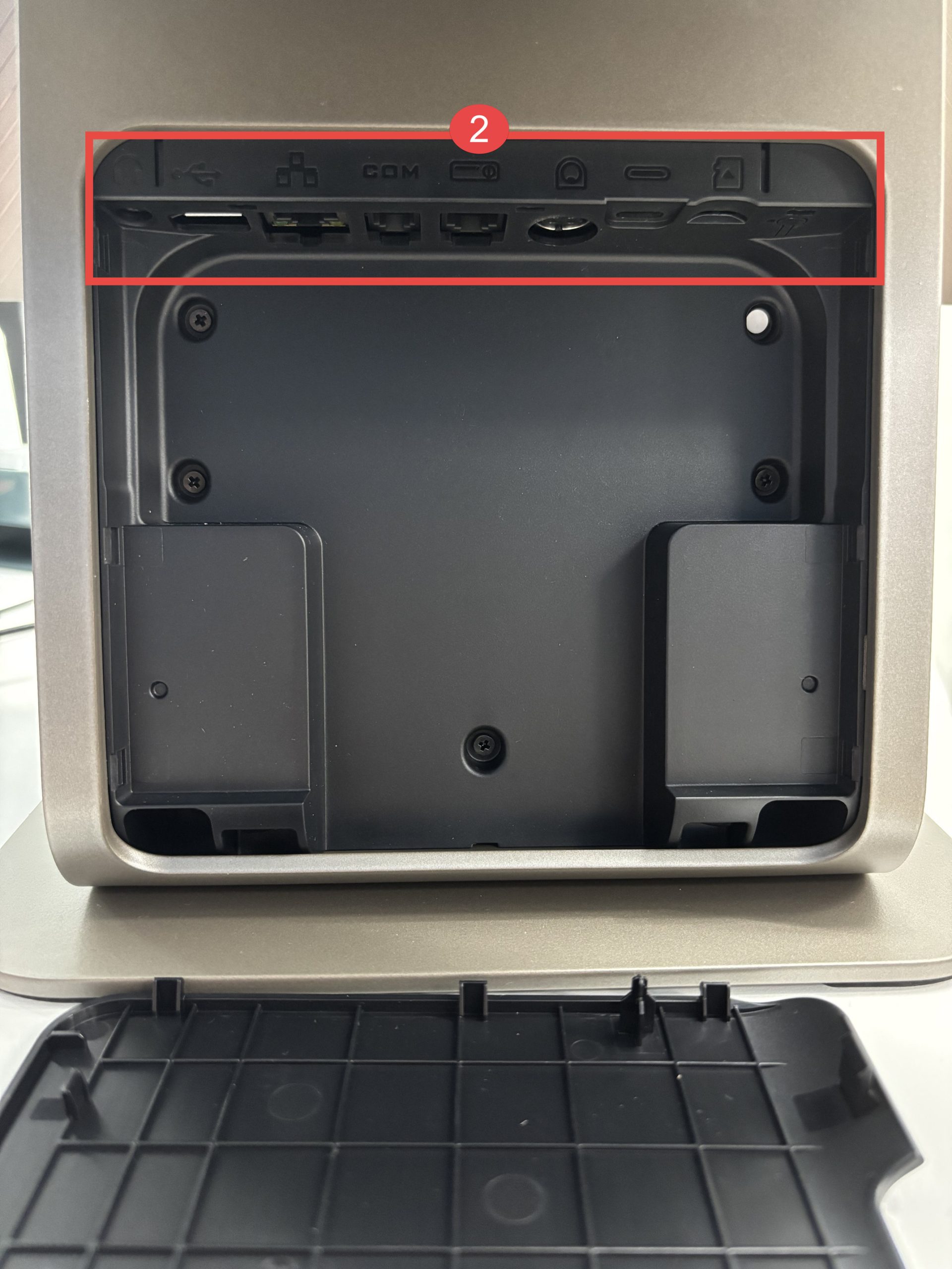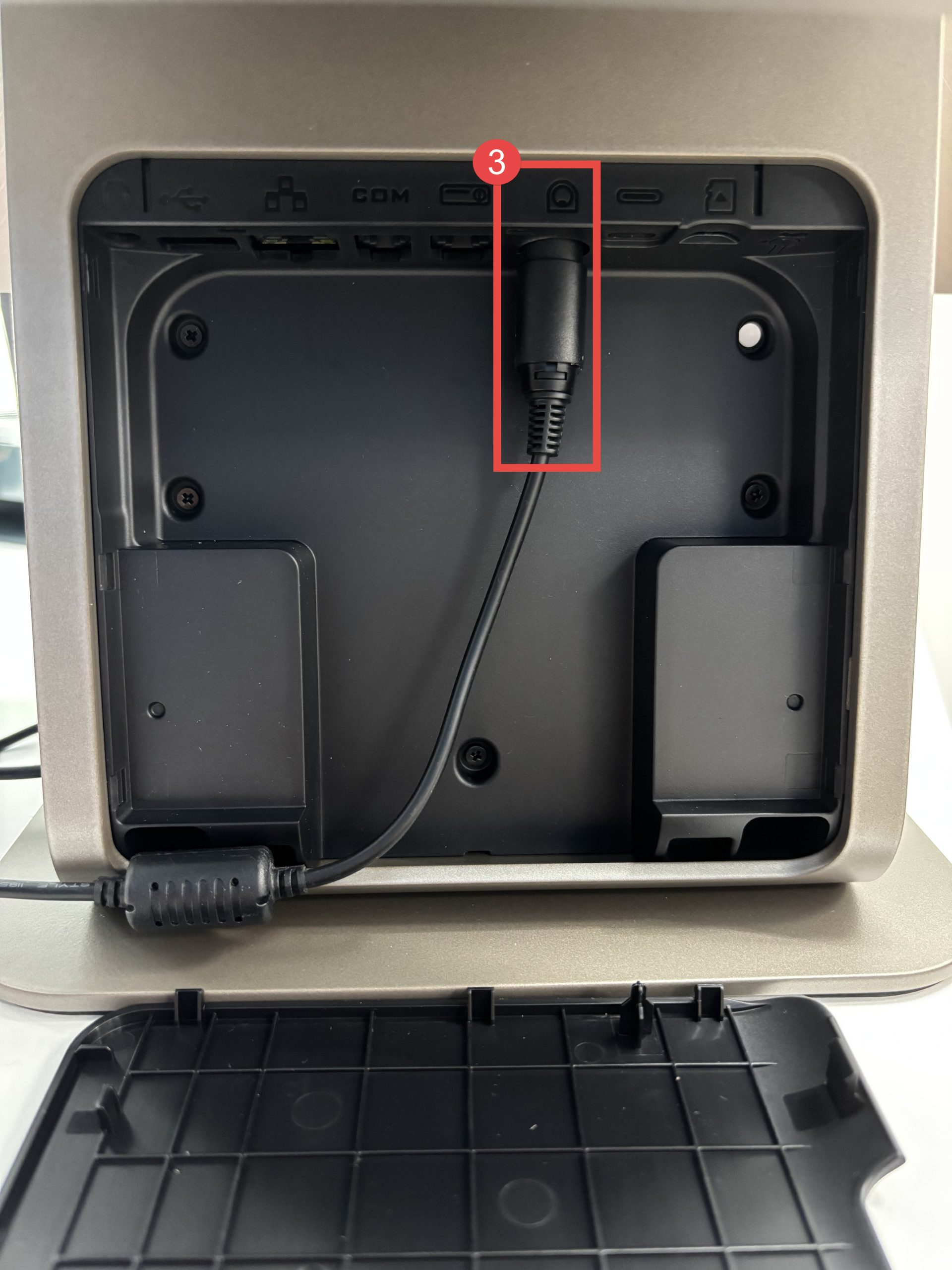 1. เปิดฝาเครื่องทางด้านหลังเพื่อเสียบปลั๊กเข้ากับตัวเครื่อง POS