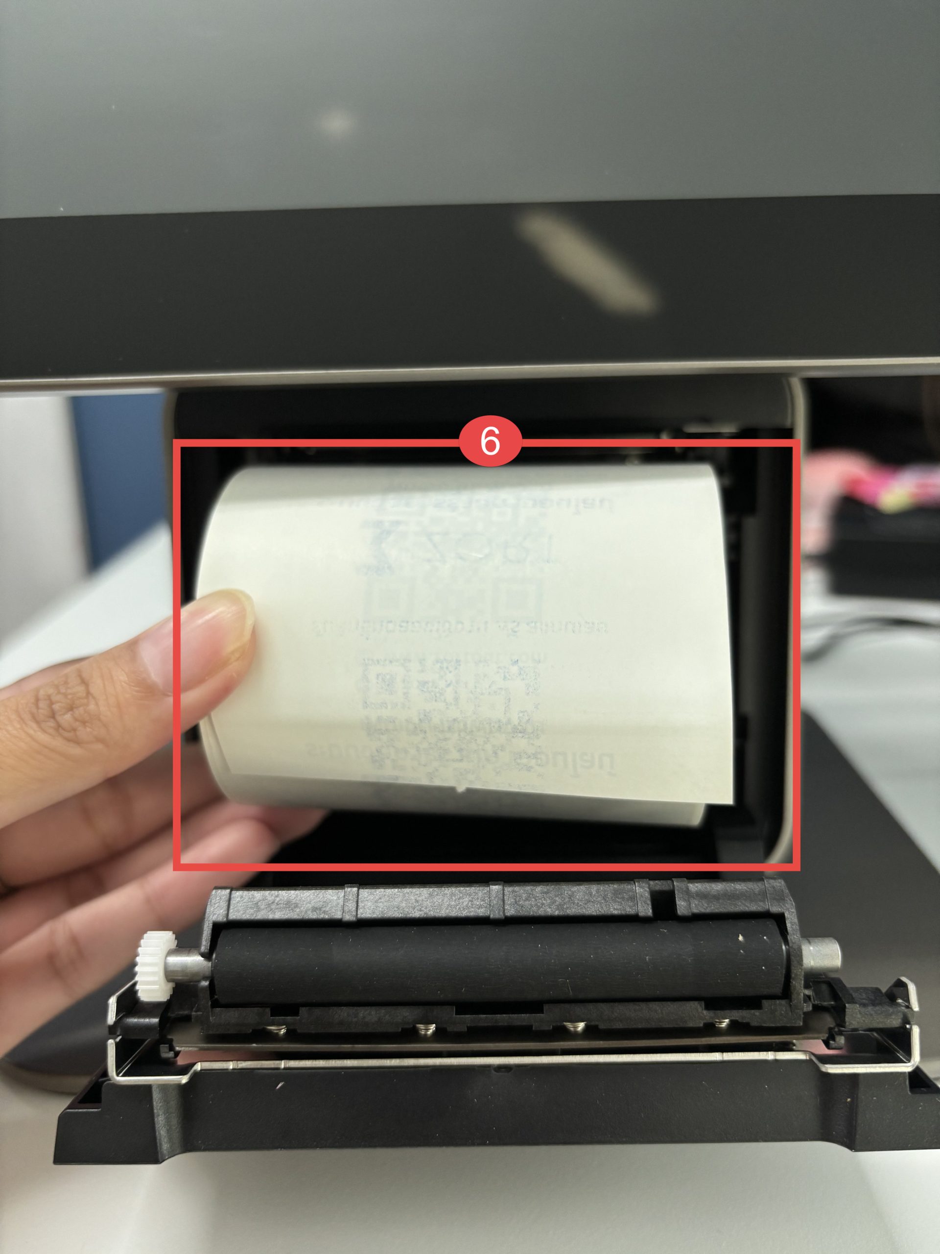 6. จากนั้นให้ผู้ใช้งานใส่ม้วนกระดาษเข้าไปในช่อง โดยให้ปลายกระดาษอยู่ด้านบนสุด