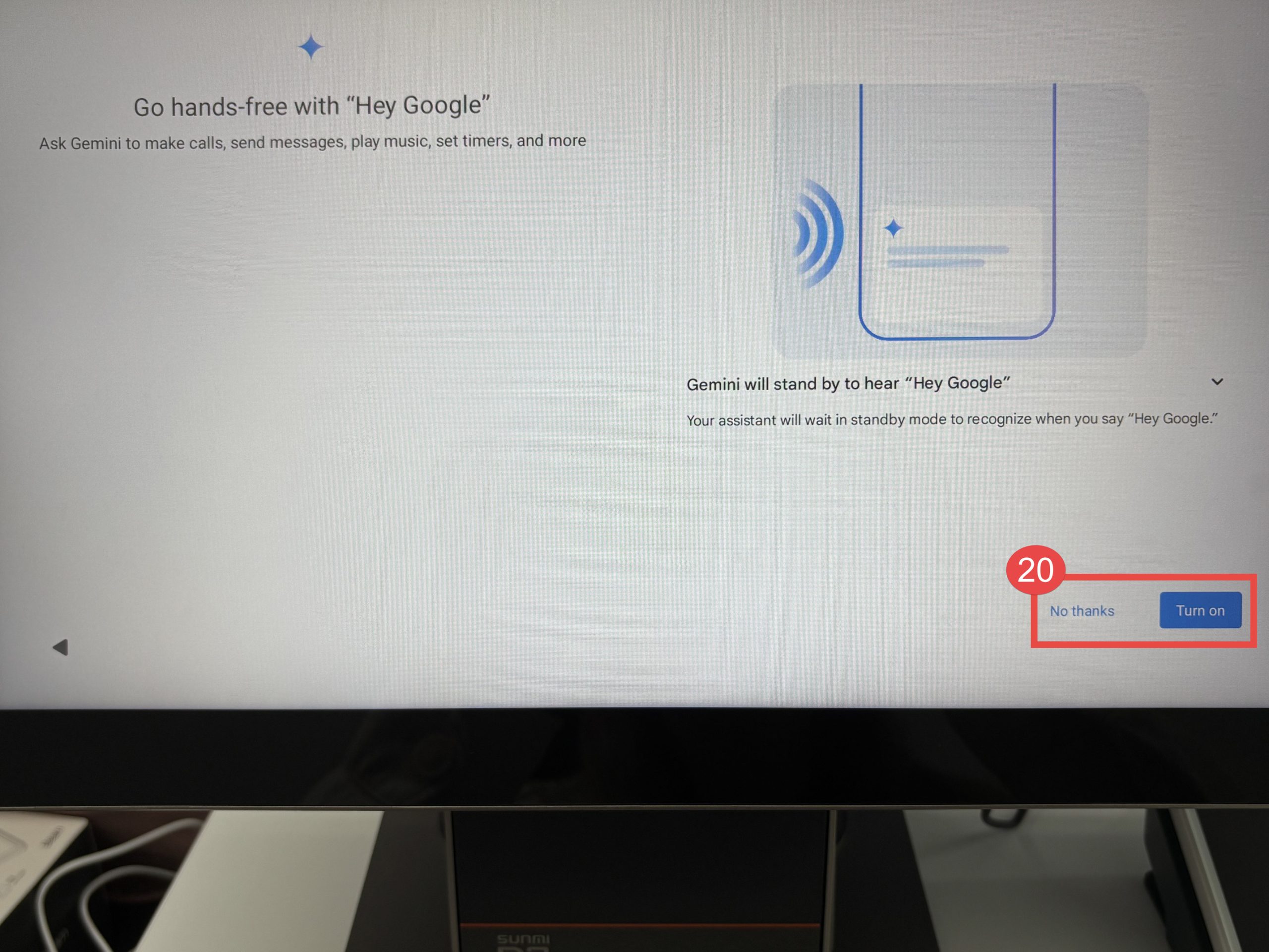20. กรณีผู้ใช้งานต้องการใช้งานคำสั่งด้วยเสียงกับ Gemini ให้กดปุ่ม “Turn on” หากไม่ต้องการให้กดปุ่ม “No thanks”
