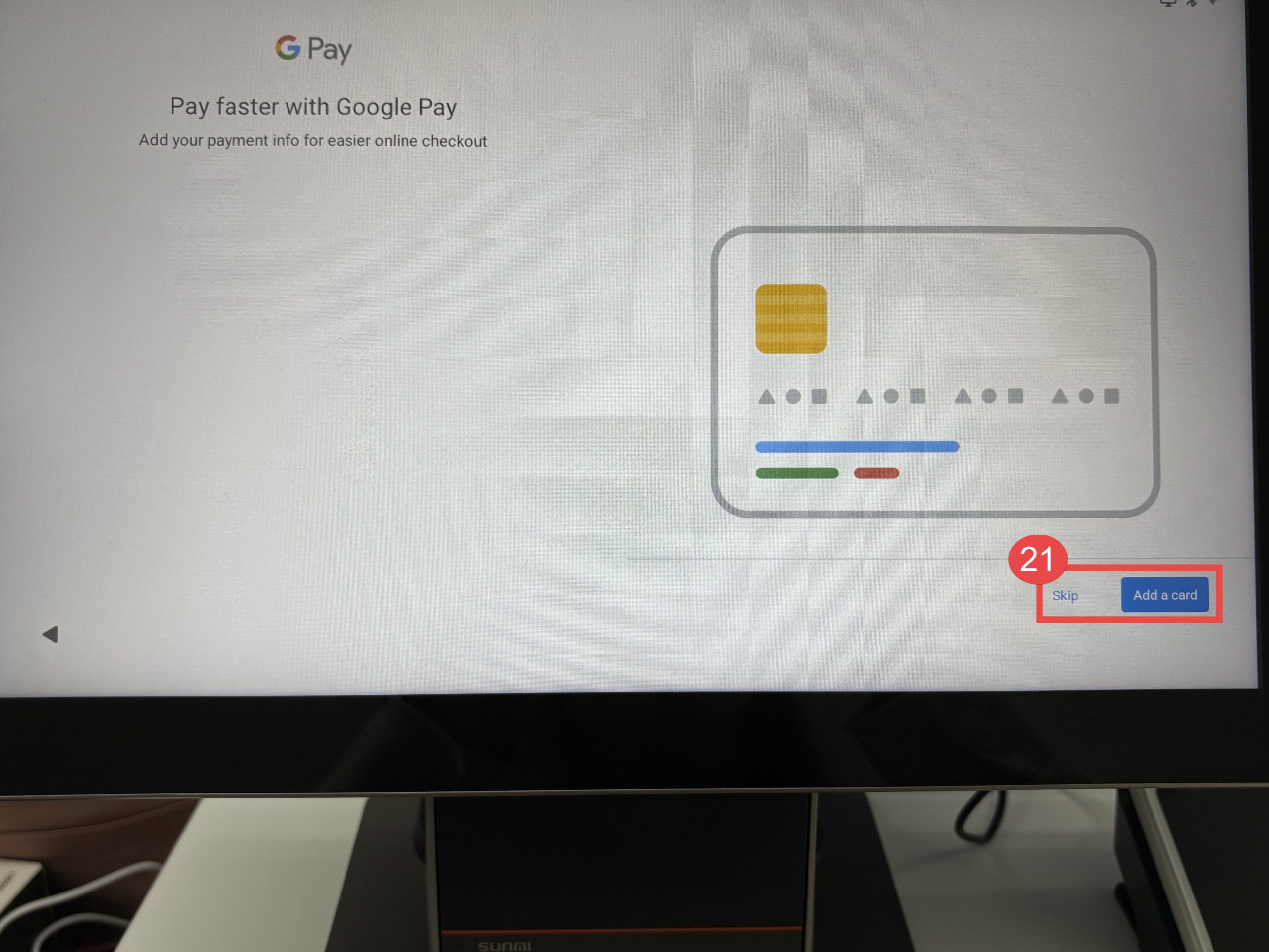 21. เพิ่มบัตรเครดิตที่ต้องการใช้งานกับ Google Pay หากไม่ต้องการเพิ่มข้อมูลให้กดปุ่ม “Skip”