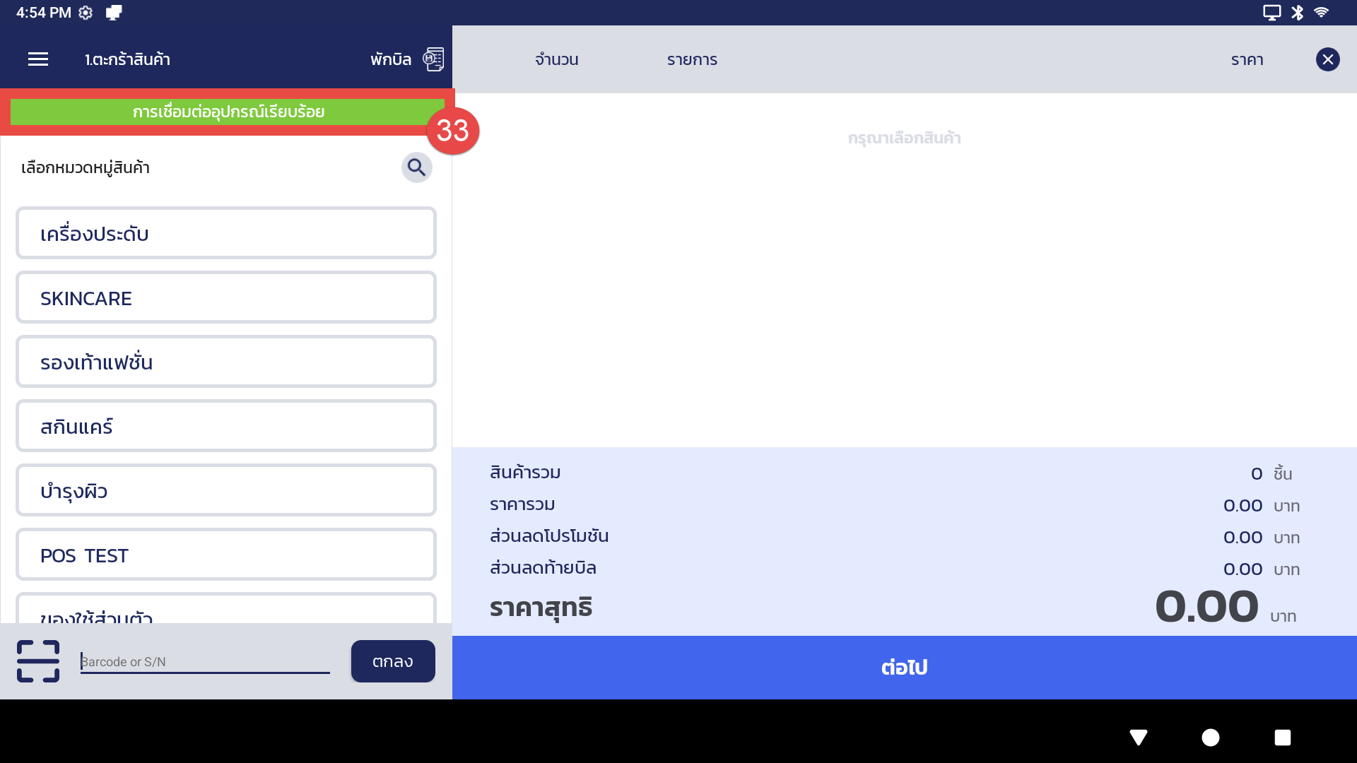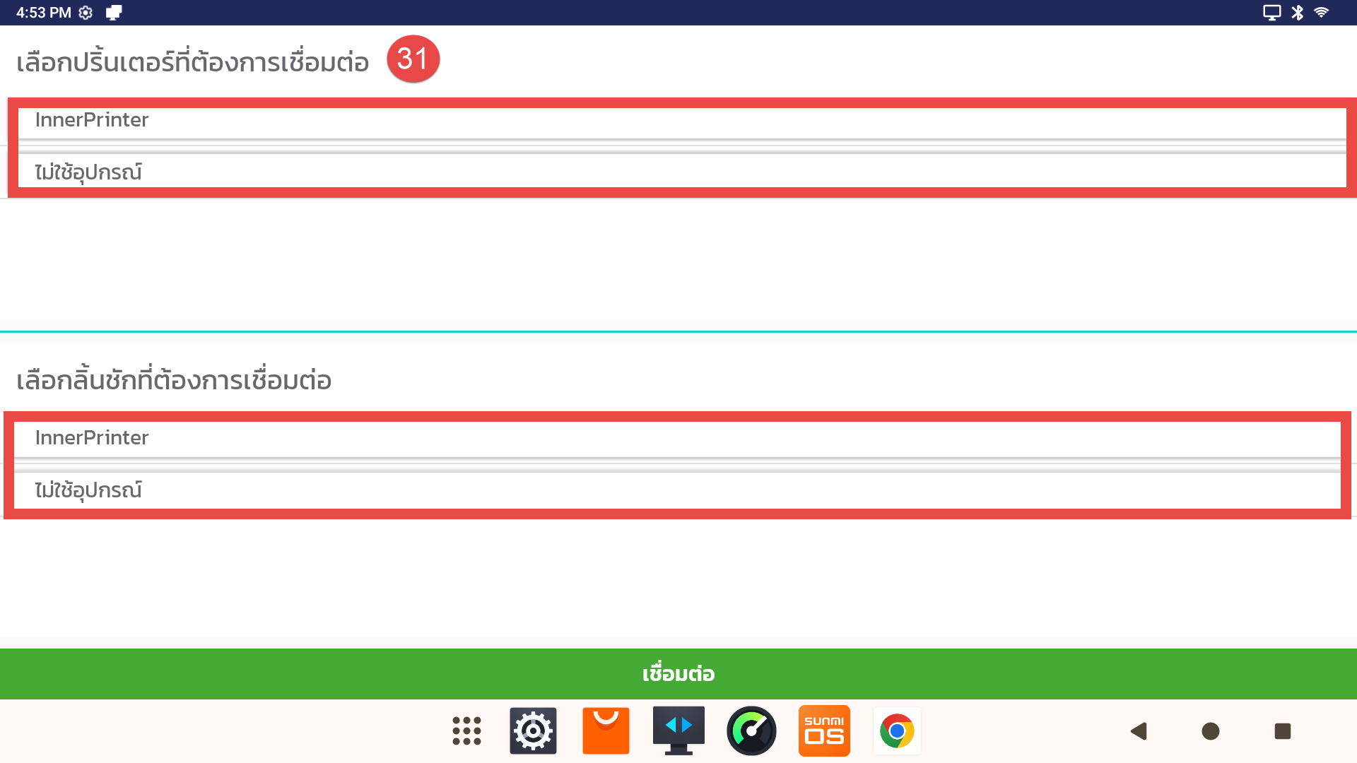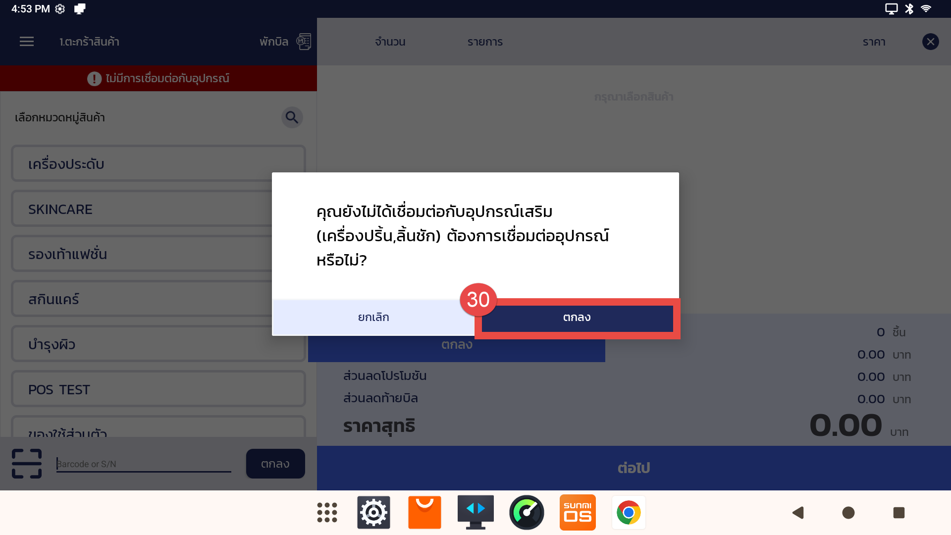 30. กรณีผู้ใช้งานต้องการเชื่อมต่ออุปกรณ์เสริม เช่น เครื่องปริ้น หรือ ลิ้นชัก ให้กดปุ่ม “ตกลง”