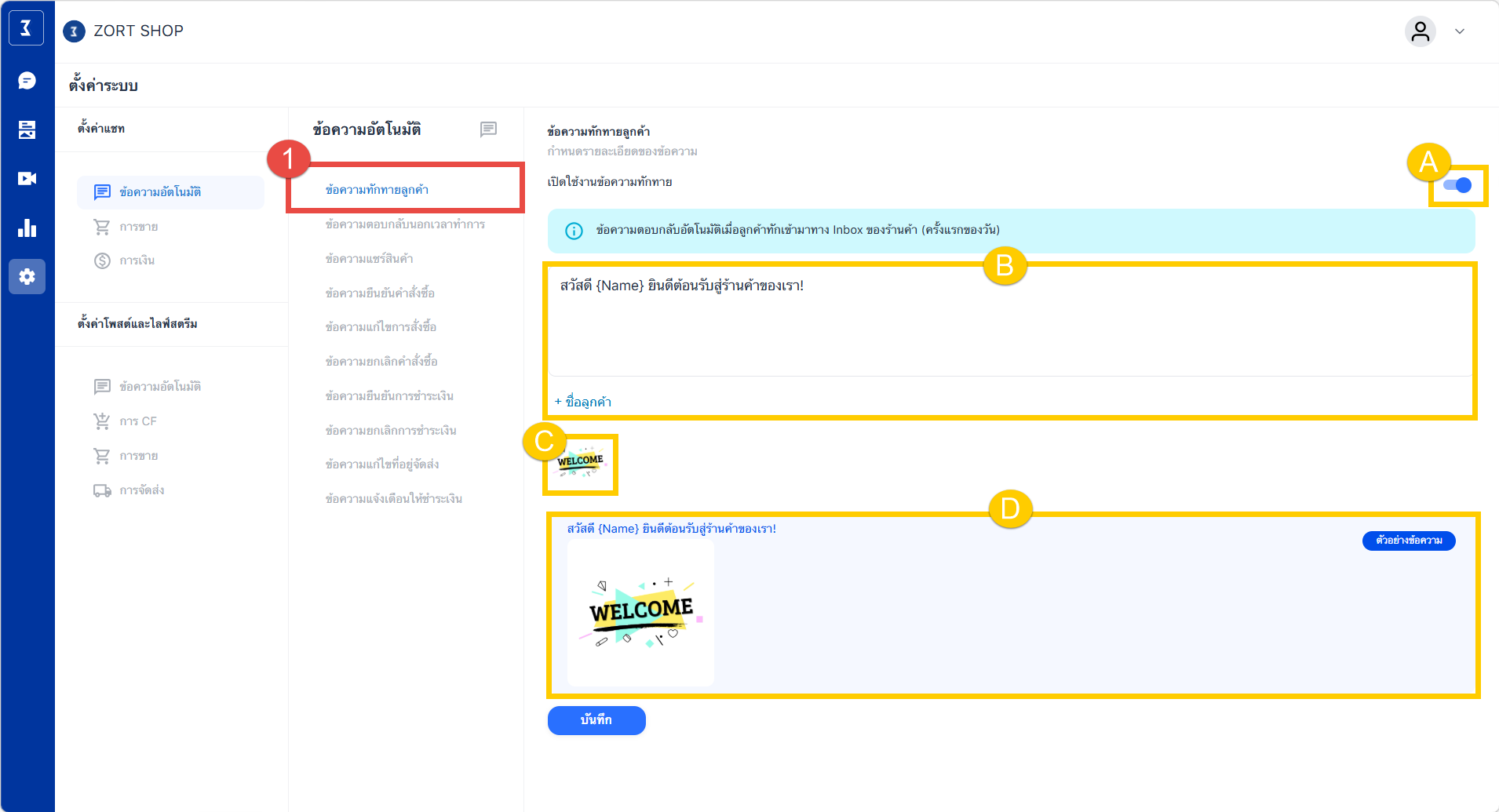 C. ช่องสำหรับกรอกข้อความทักทายที่ต้องการกรณีผู้ใช้งานต้องการให้ข้อความดังกล่าวแสดงชื่อลูกค้าด้วย สามารถคลิกที่ปุ่ม “+ชื่อลูกค้า” ได้