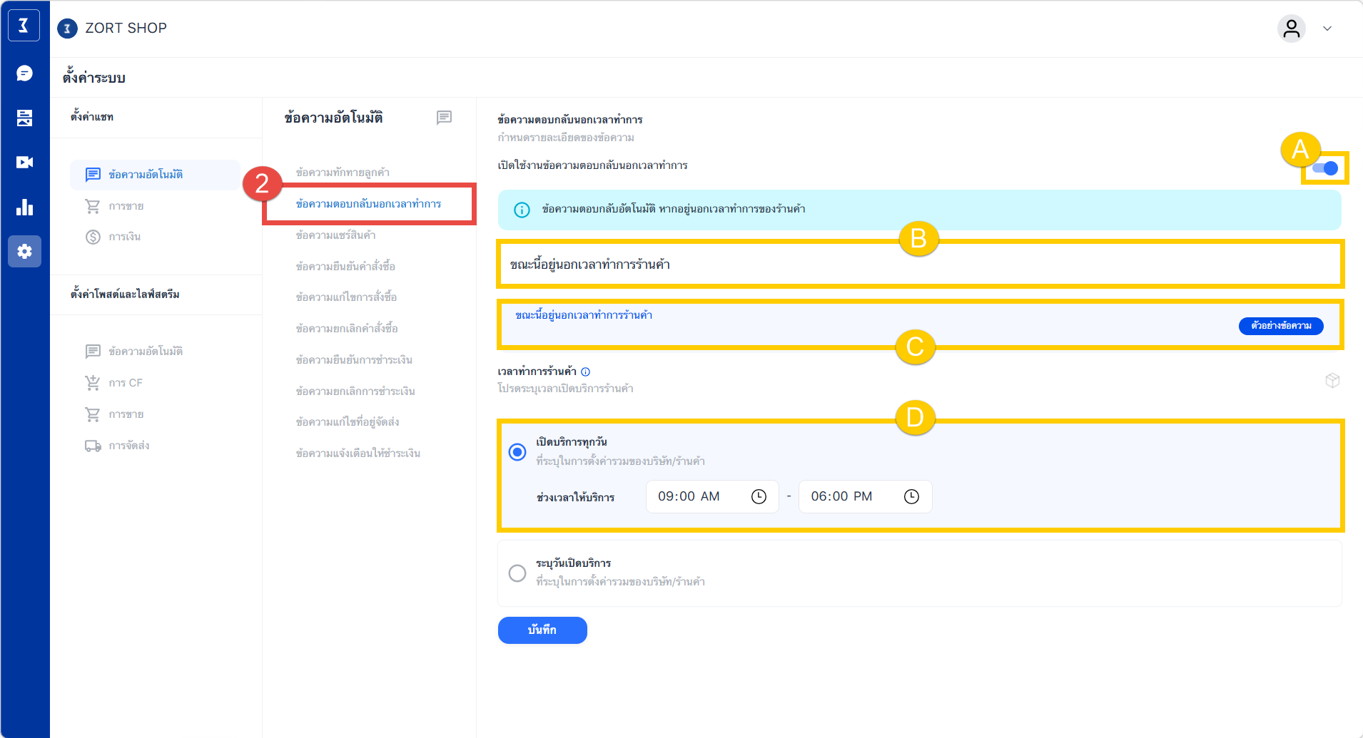 2. ข้อความตอบกลับนอกเวลาทำการ: ระบบจะส่งข้อความตอบกลับอัตโนมัติ เมื่อลูกค้าทัก Inbox ของร้านค้านอกเวลาทำการ