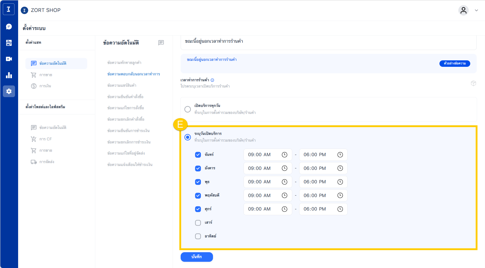 E. เวลาทำการร้านค้า (เปิดบริการทุกวัน) : กรณีร้านค้าเปิดบริการเป็นบางวัน ผู้ใช้งานสามารถตั้งค่าวันและช่วงเวลาเปิดให้บริการได้ ตัวอย่างเช่น เปิดให้บริการทุกวันจันทร์ถึงศุกร์ เวลา 09.00 – 18.00 น.