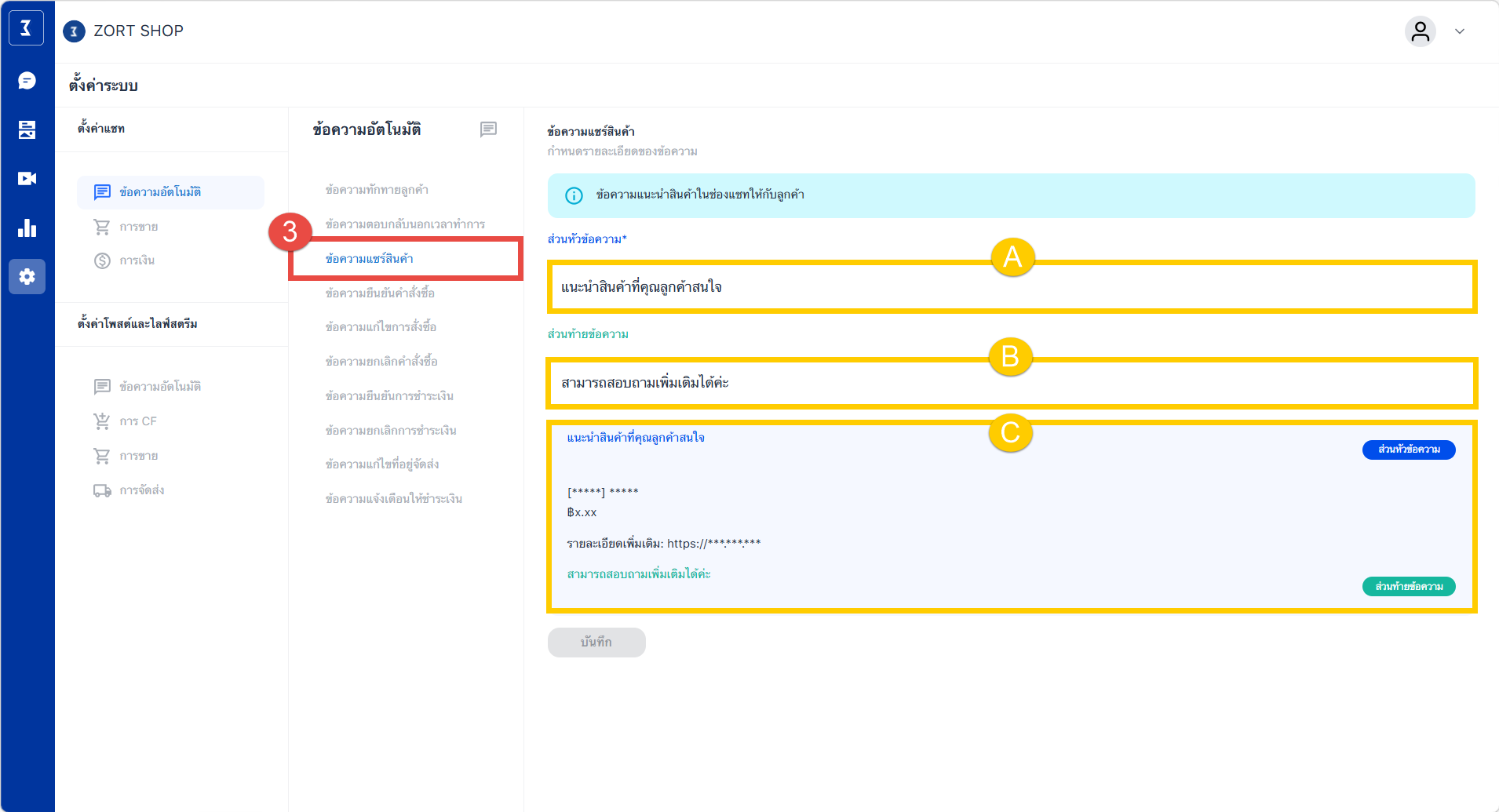 3. ข้อความแชร์สินค้า: เมื่อผู้ใช้งานกดแชร์สินค้าให้ลูกค้าผ่านทางช่องแชท ระบบจะส่งข้อความตามที่ผู้ใช้งานตั้งค่าไว้ (ตั้งค่าได้เฉพาะช่วงหัวและส่วนท้ายของข้อความเท่านั้น)