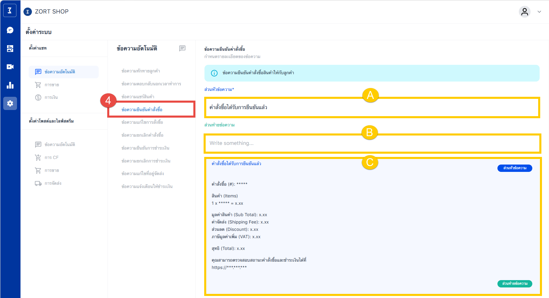 4. ข้อความยืนยันคำสั่งซื้อ: เมื่อผู้ใช้งานสร้างคำสั่งซื้อเรียบร้อยแล้ว ระบบจะส่งข้อความยืนยันคำสั่งซื้อให้ลูกค้าตามข้อความที่ตั้งค่าไว้ (ตั้งค่าได้เฉพาะช่วงหัวและส่วนท้ายของข้อความเท่านั้น)