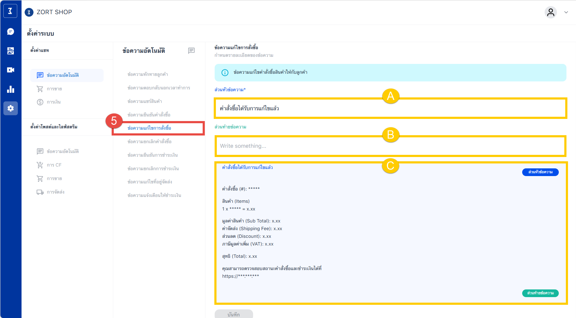 5. ข้อความแก้ไขการสั่งซื้อ: เมื่อผู้ใช้งานมีการแก้ไขคำสั่งซื้อ ระบบจะส่งข้อความแก้ไขคำสั่งซื้อให้ลูกค้าตามข้อความที่ตั้งค่าไว้ (ตั้งค่าได้เฉพาะช่วงหัวและส่วนท้ายของข้อความเท่านั้น)