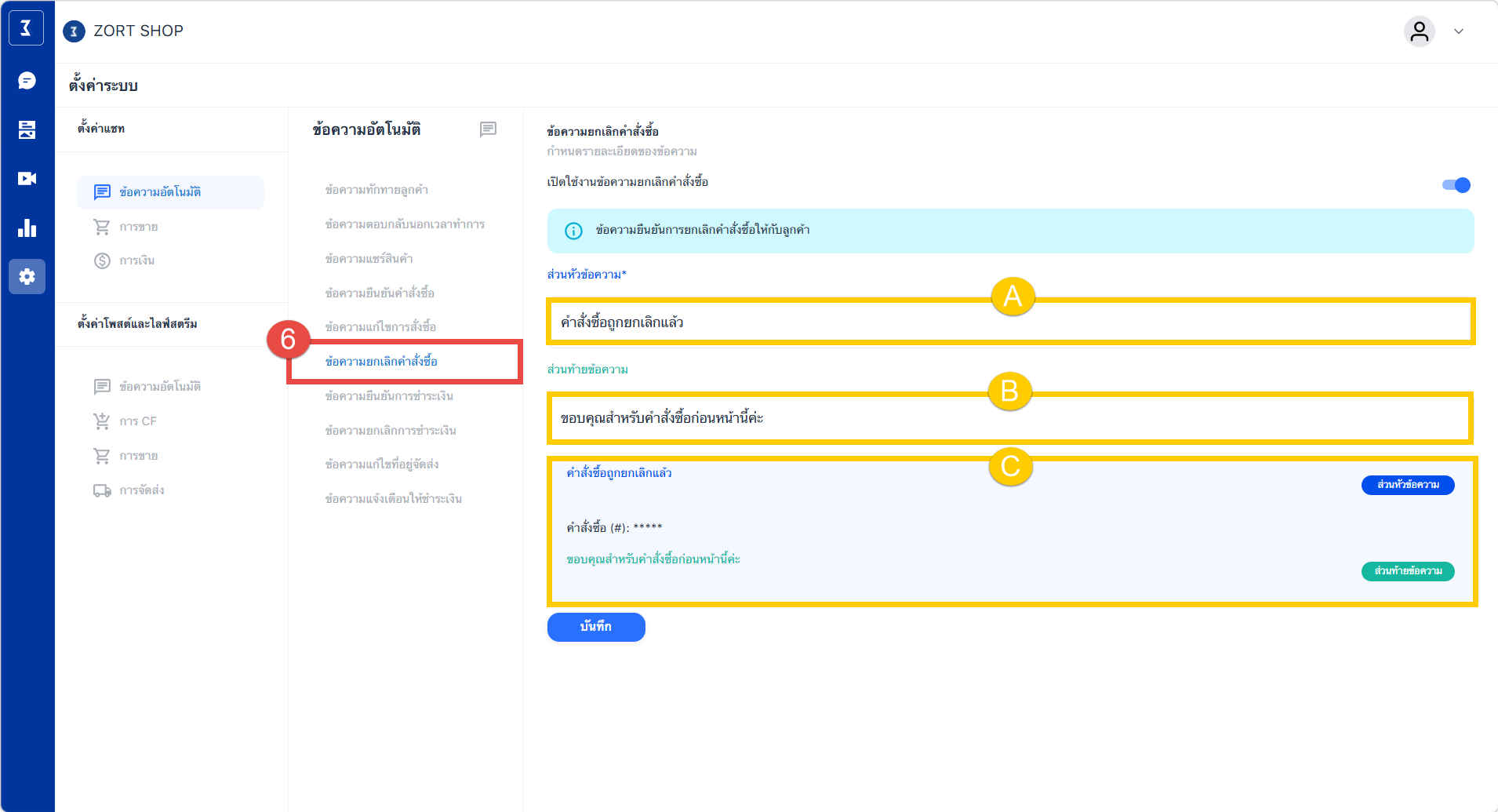 6. ข้อความยกเลิกคำสั่งซื้อ: เมื่อผู้ใช้งานกดยกเลิกคำสั่งซื้อเรียบร้อยแล้ว ระบบจะส่งข้อความยกเลิกคำสั่งซื้อให้ลูกค้าตามข้อความที่ตั้งค่าไว้ (ตั้งค่าได้เฉพาะช่วงหัวและส่วนท้ายของข้อความเท่านั้น)