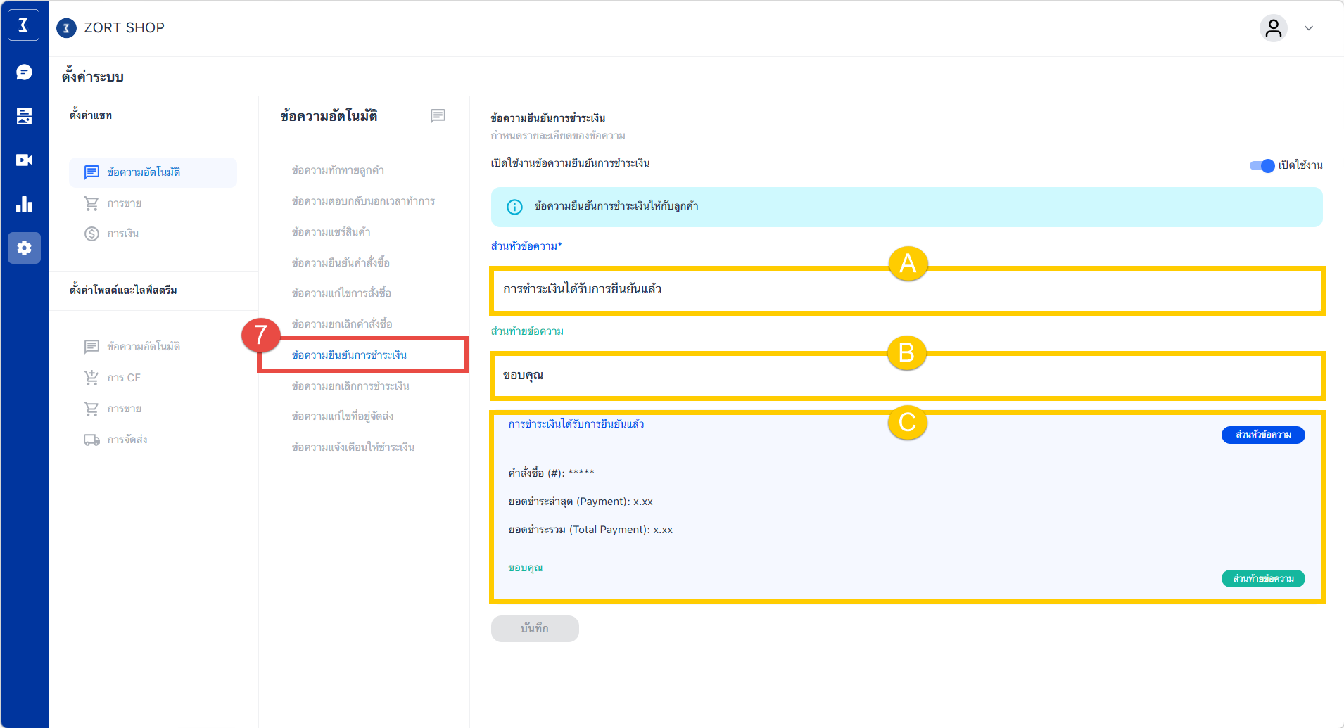 7. ข้อความยืนยันการชำระเงิน: เมื่อผู้ใช้งานตรวจสอบการชำระเงินเรียบร้อยแล้ว ระบบจะส่งข้อความยืนยันการชำระเงินให้ลูกค้าตามข้อความที่ตั้งค่าไว้ (ตั้งค่าได้เฉพาะช่วงหัวและส่วนท้ายของข้อความเท่านั้น)