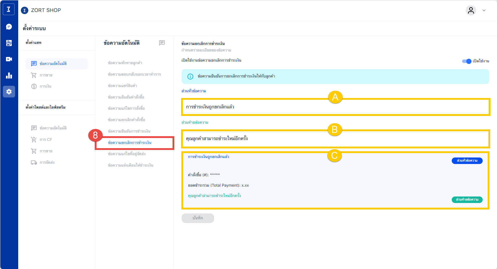 8.ข้อความยกเลิกการชำระเงิน : เมื่อผู้ใช้งานยกเลิกการชำระเงิน ระบบจะส่งข้อความยกเลิกการชำระเงินให้ลูกค้าตามข้อความที่ตั้งค่าไว้ (ตั้งค่าได้เฉพาะช่วงหัวและส่วนท้ายของข้อความเท่านั้น)