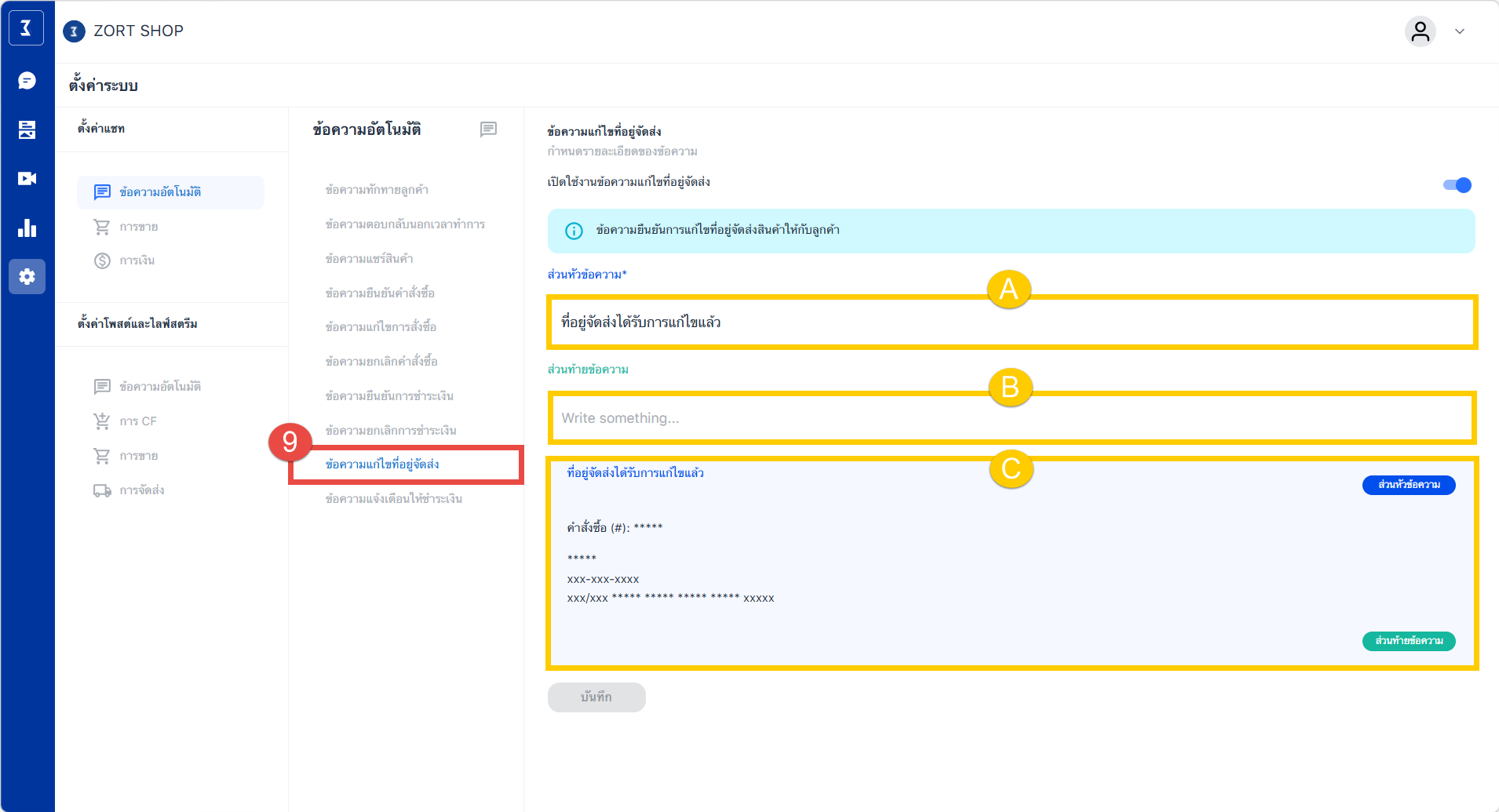 9. ข้อความแก้ไขที่อยู่จัดส่ง: เมื่อผู้ใช้งานทำการแก้ไขที่อยู่จัดส่ง ระบบจะส่งข้อความแก้ไขที่อยู่จัดส่งให้ลูกค้าตามข้อความที่ตั้งค่าไว้ (ตั้งค่าได้เฉพาะช่วงหัวและส่วนท้ายของข้อความเท่านั้น)