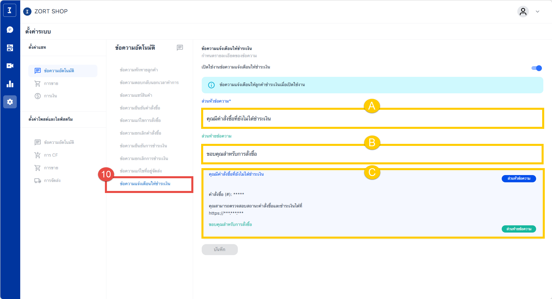 10. ข้อความแจ้งเตือนให้ชำระเงิน :กรณีลูกค้ายังไม่ได้ชำระเงิน ระบบจะส่งข้อความแจ้งเตือนให้ลูกค้าชำระเงิน โดยข้อความที่แสดงผลจะมาจากการข้อความที่ตั้งค่าวไว้