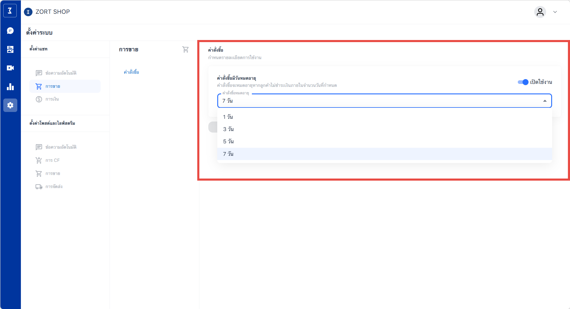 ตั้งค่าวันหมดอายุคำสั่งซื้อ : กรณีลูกค้ายังไม่ชำระเงินภายในวันที่ผู้ใช้งานตั้งค่าไว้ คำสั่งซื้อดังกล่าวจะหมดอายุและระบบจะยกเลิกคำสั่งซื้ออัตโนมัติ