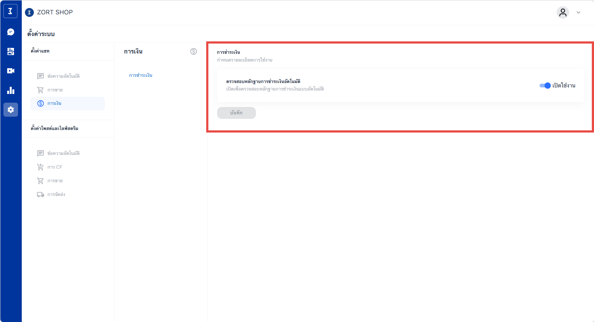 ตรวจสอบหลักฐานการชำระเงินอัตโนมัติ : ปุ่มเปิด-ปิดการใช้งานฟีเจอร์ตรวจสอบสลิปอัตโนมัติในหน้าแชท (อ่านคู่มือการใช้งานเพิ่มเติม คลิก)