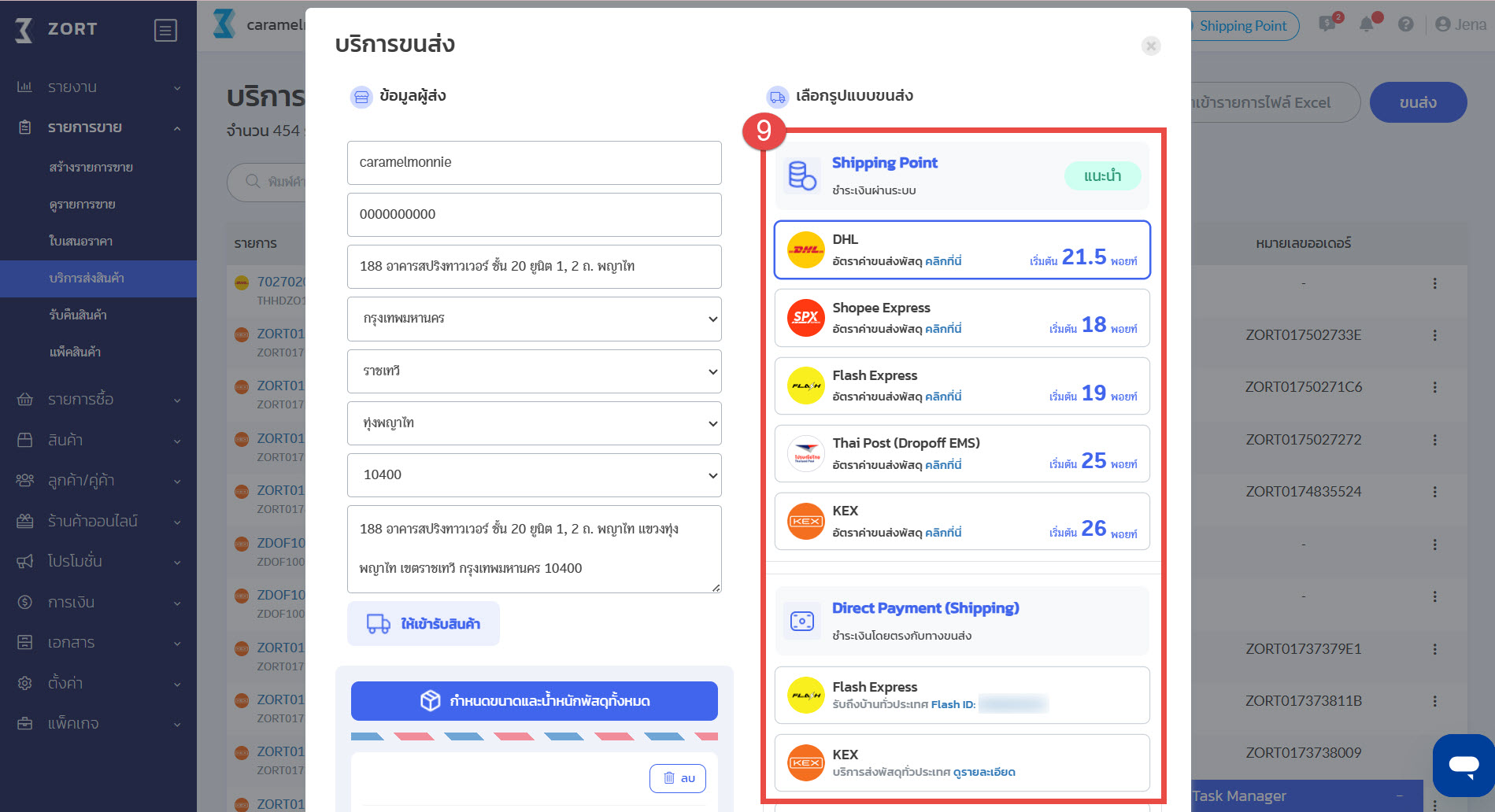 9. ระบบจะแสดง pop up หน้ากดเรียกขนส่งขนส่งขึ้นมาให้ ร้านค้าสามารถเลือกขนส่งที่ต้องการใช้งานได้เลย