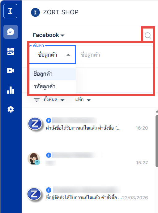 3. ไอคอนค้นหา : ผู้ใช้งานสามารถค้นหาแชทลูกค้าจากชื่อหรือรหัสลูกค้าได้