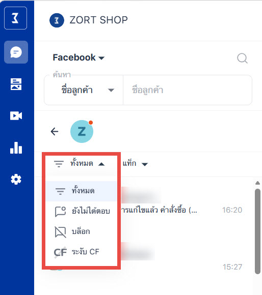 4. ฟิลเตอร์การแสดงผลแชทลูกค้า: ผู้ใช้งานสามารถฟิลเตอร์แชทลูกค้าได้ 4 หัวข้อ คือ