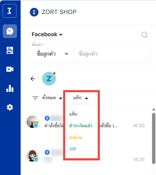 5. แท็ก : ระบบจะแสดงรายชื่อแท็กที่ผู้ใช้งานสร้างไว้ โดยผู้ใช้งานสามารถฟิลเตอร์แชทลูกค้าตามแท็กที่ต้องการได้