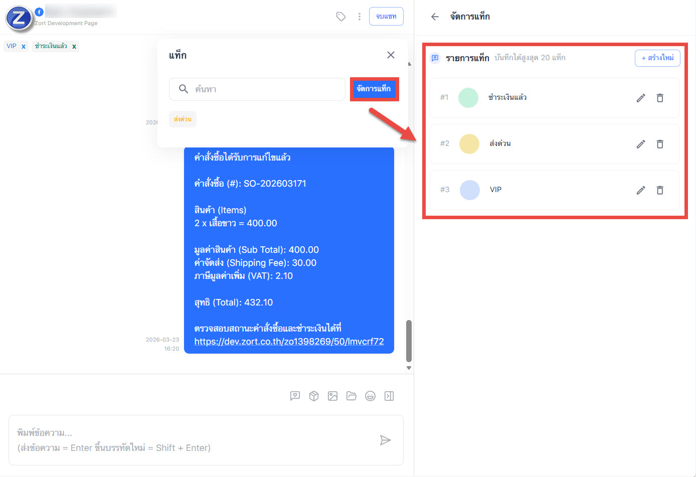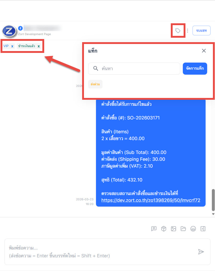 6. ไอคอนแท็ก : ผู้ใช้งานสามารถค้นหาแท็ก ติดแท็กหรือลบแท็กในแชทลูกค้าได้