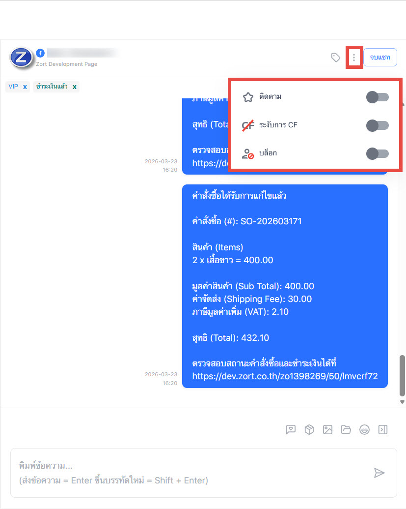 7. ไอคอนจุดสามจุด: ผู้ใช้งานสามารถกดติดตาม ระงับ CF หรือบล็อกแชทลูกค้าได้