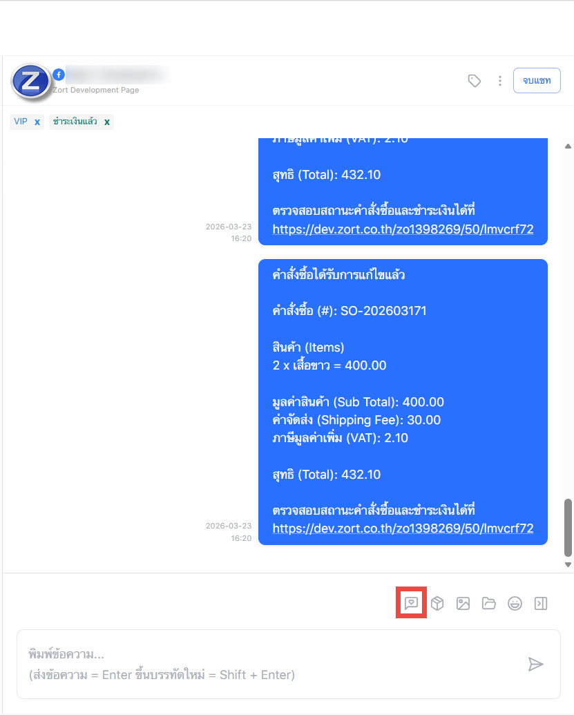 2) ช่องสำหรับตอบข้อความลูกค้า