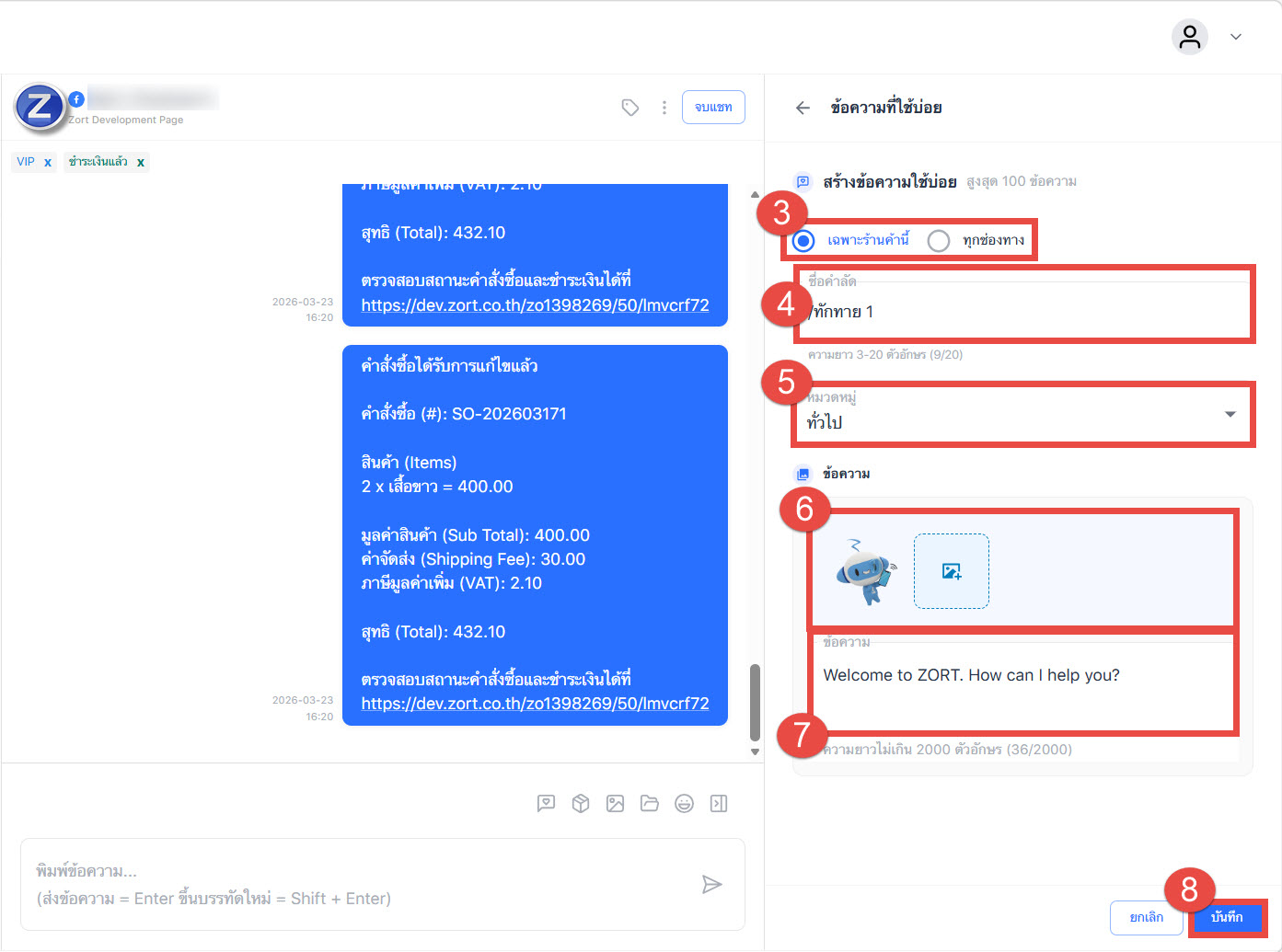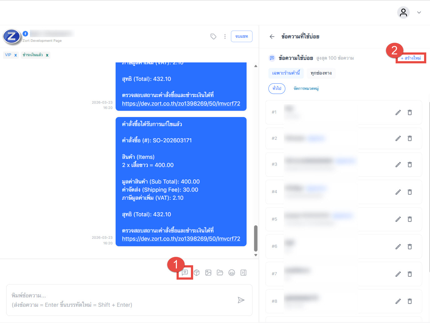 8. ข้อความที่ใช้บ่อย : ผู้ใช้งานสามารถสร้าง แก้ไขหรือลบข้อความที่ใช้บ่อยได้ (ระบบจะจำกัดการสร้างข้อความสูงสุด 100 ข้อความ/ร้านค้า และ 50 ข้อความ/ทุกช่องทาง)