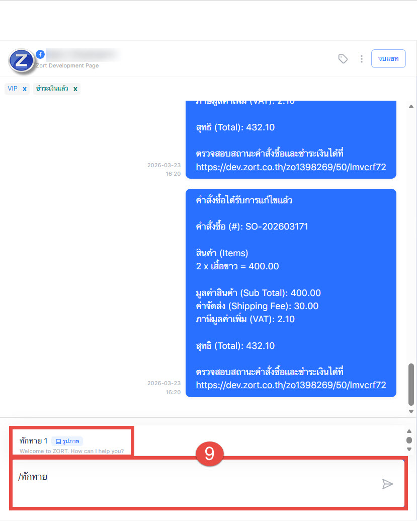 9) จากนั้นกรอก / ตามด้วยคำลัดที่ต้องการลงในช่องแชท ระบบจะแสดงคำลัดขึ้นมาให้ตามตัวอย่าง