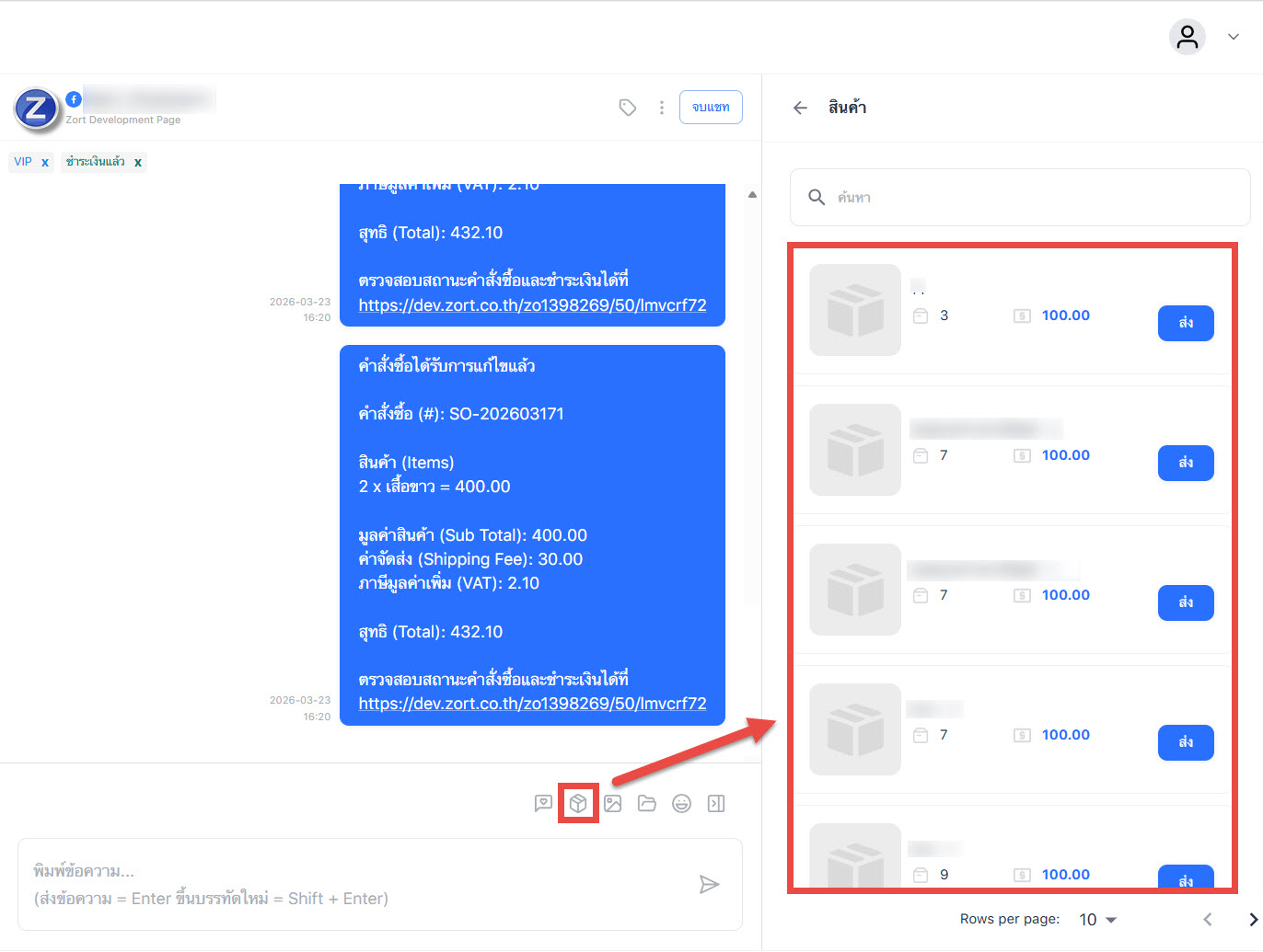9. ไอคอนสินค้า : ผู้ใช้งานสามารถเลือกสินค้าที่ต้องการแนะนำให้กับลูกค้าผ่านช่องแชทได้