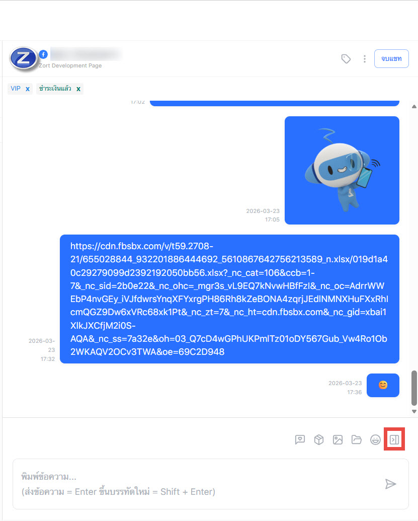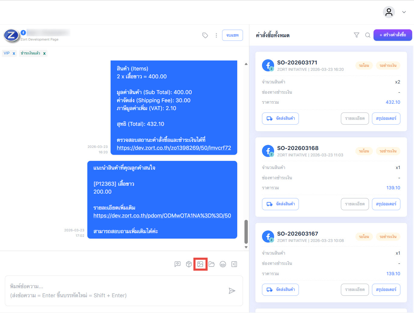 10. ไอคอนส่งรูปภาพ : ผู้ใช้งานสามารถส่งรูปภาพให้ลูกค้าผ่านช่องแชทได้