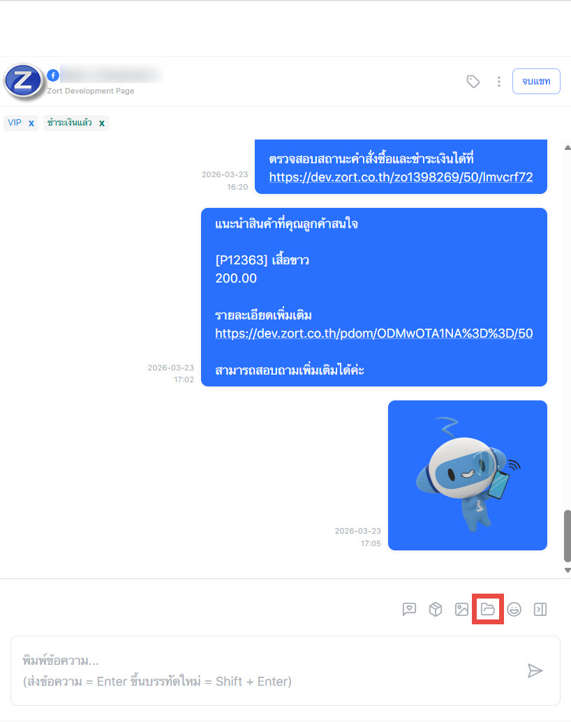 11. ไอคอนไฟล์ : ผู้ใช้งานสามารถส่งไฟล์ต่าง ๆ ให้ลูกค้าผ่านช่องแชทได้
