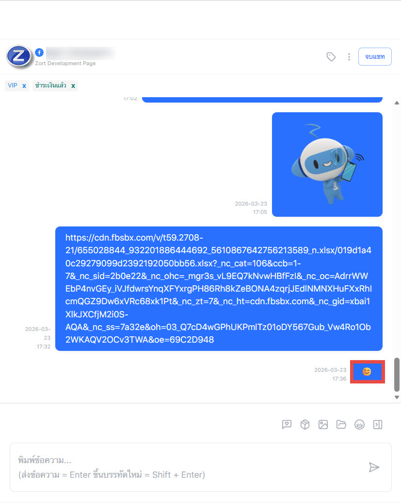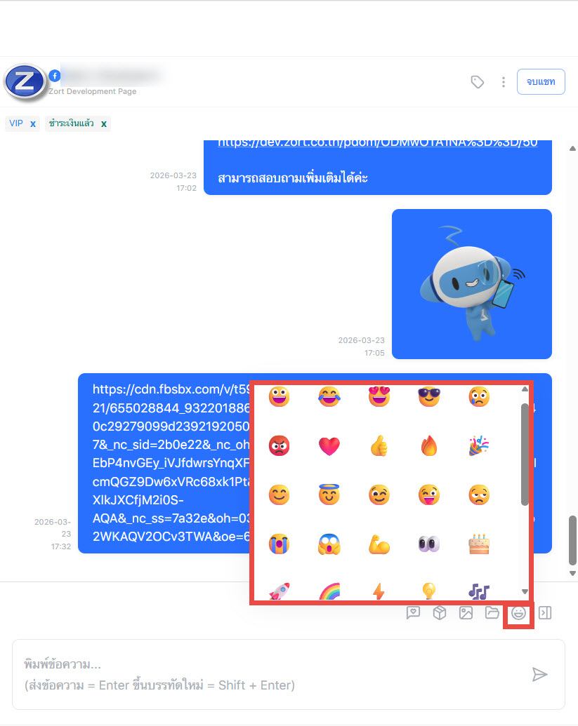 12. ไอคอนอิโมจิ : ผู้ใช้งานสามารถส่งอิโมจิต่าง ๆ ให้ลูกค้าผ่านช่องแชทได้