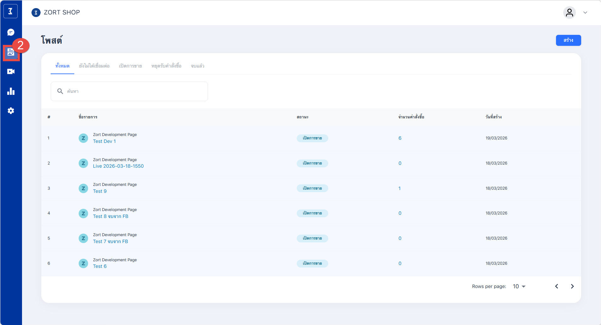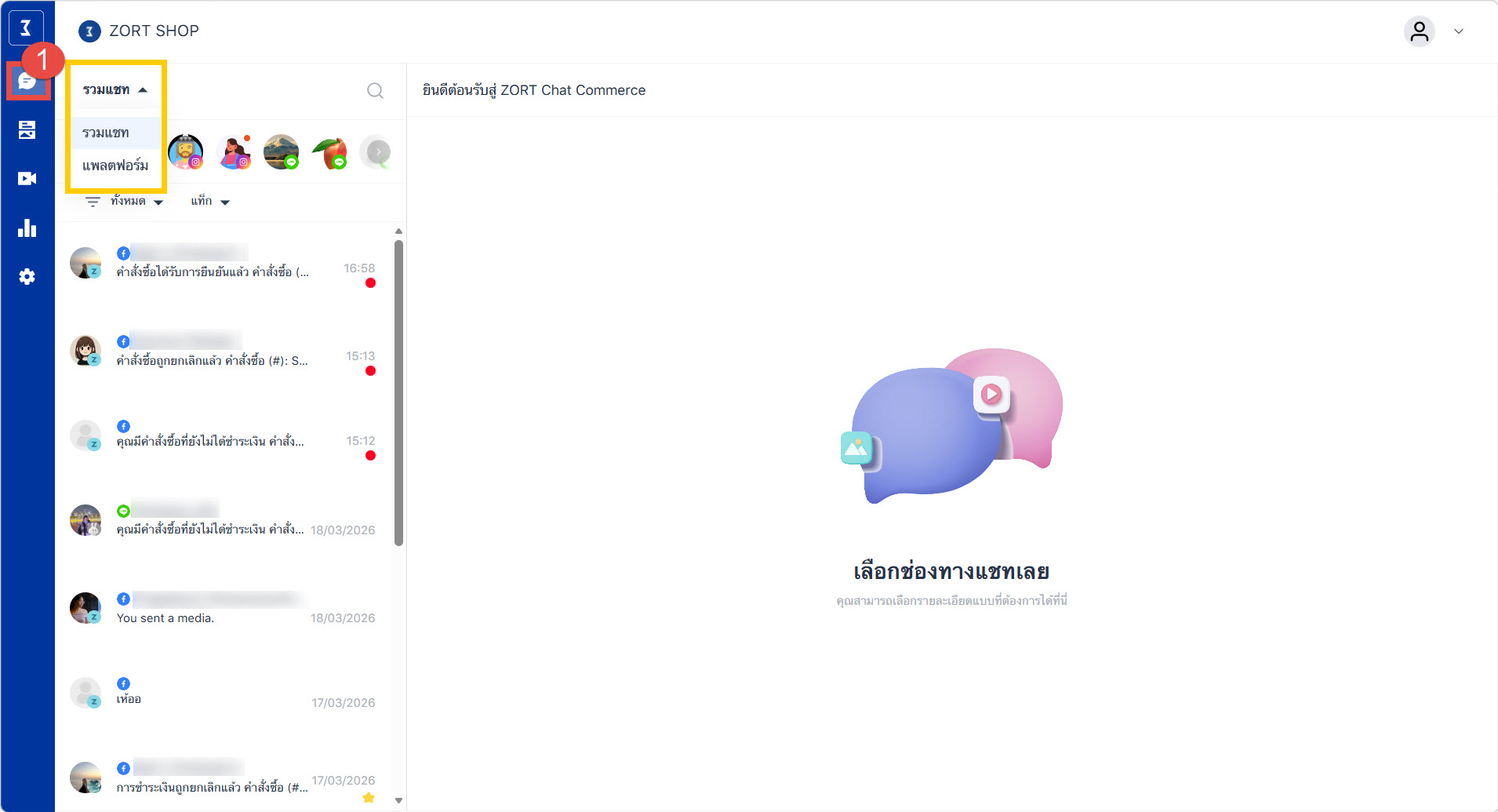 หลังจากผู้ใช้งานดำเนินเชื่อมต่อกับช่องทางการขาย Social Commerce เรียบร้อยแล้ว ผู้ใช้งานสามารถคลิกที่ปุ่ม “โซเชียลคอมเมิร์ช” ด้านบนขวามือเพื่อเข้าใช้งาน ZORT Social Chat กันได้เลย โดยระบบจะรองรับการใช้งานดังนี้