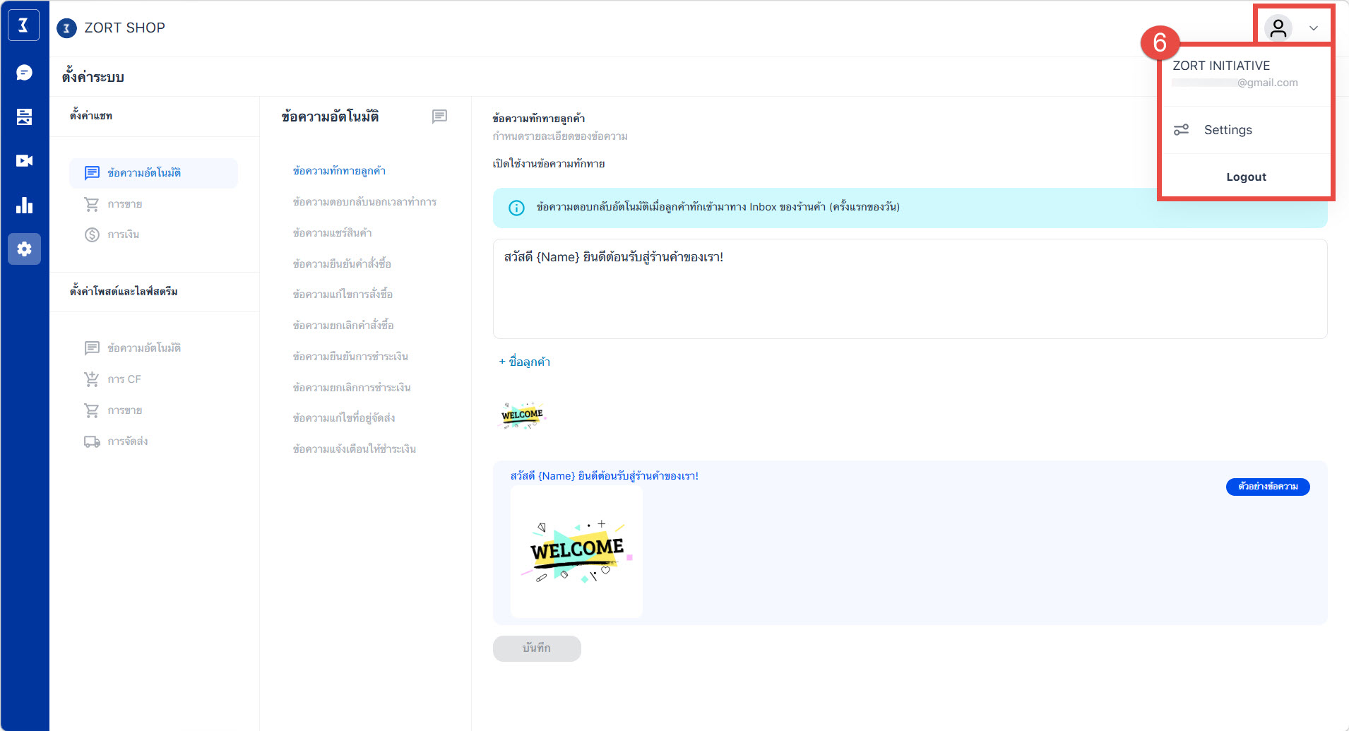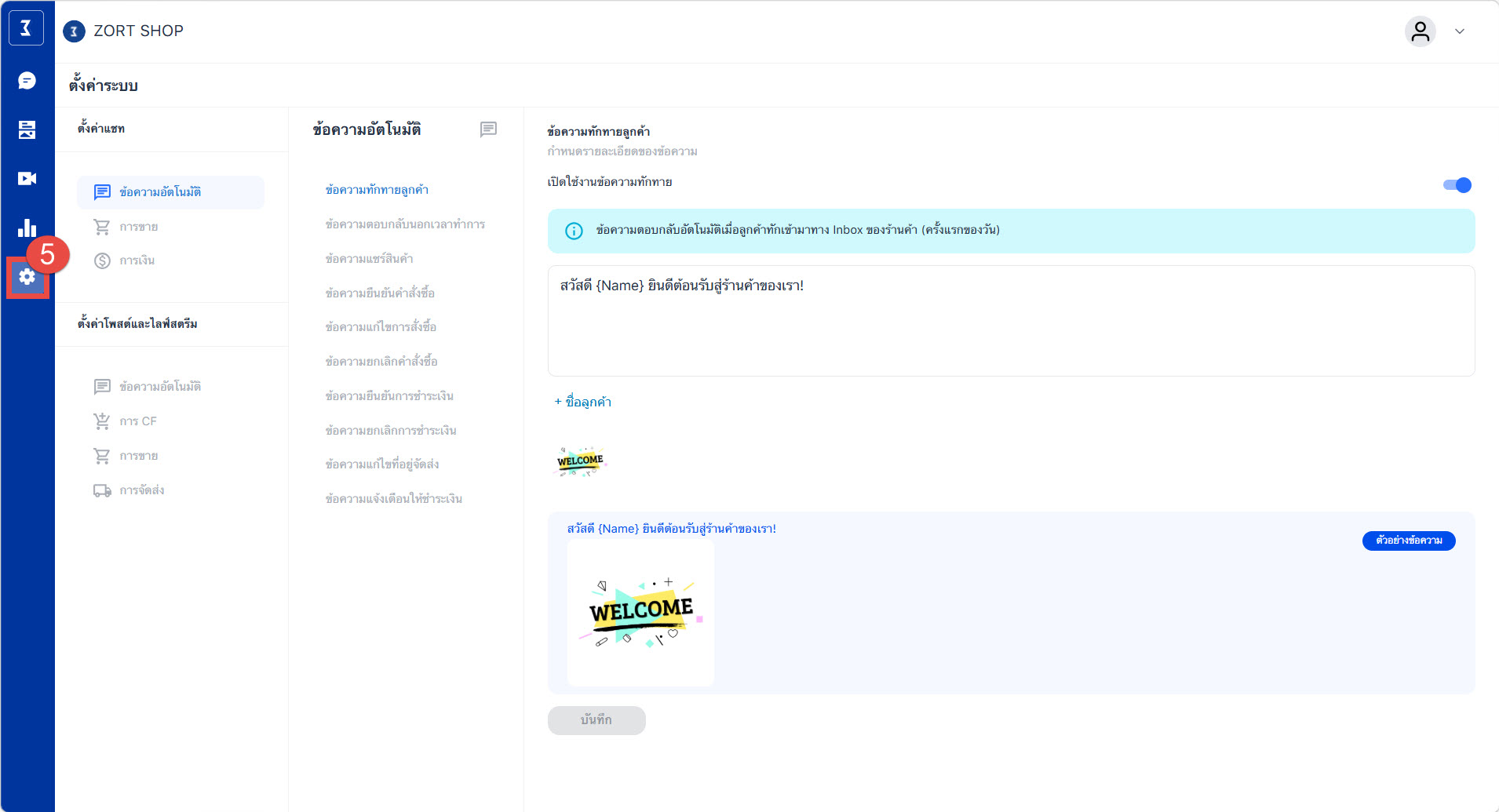 5. ตั้งค่าระบบ : ผู้ใช้งานสามารถตั้งค่าข้อมูลที่เกี่ยวข้องกับหน้า ZORT Social Chat ได้ เช่น ข้อความตอบกลับ, เงื่อนไขการ CF สินค้า เป็นต้น
