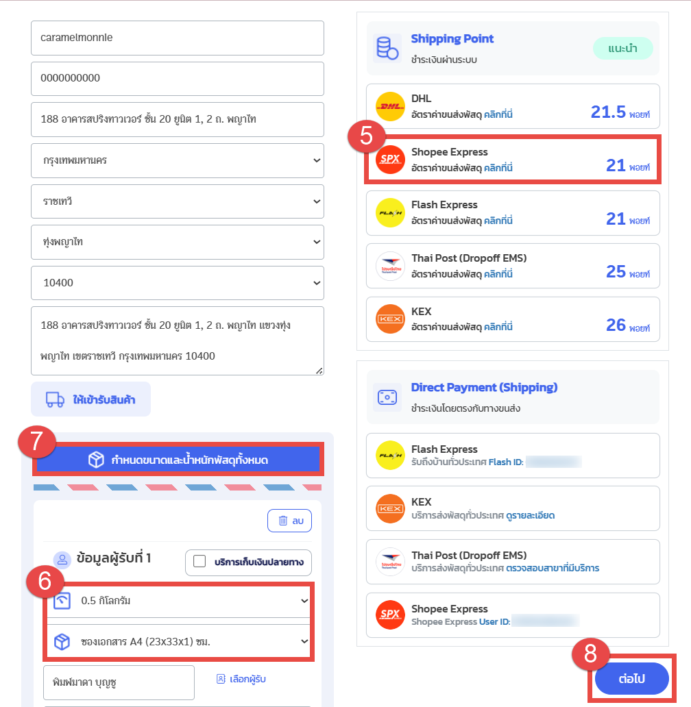8. ตรวจสอบที่อยู่ผู้ส่ง – ผู้รับให้เรียบร้อย (โดยข้อมูลที่อยู่จะอ้างอิงตามขนส่ง Shopee Express) จากนั้นกดปุ่ม “ต่อไป”