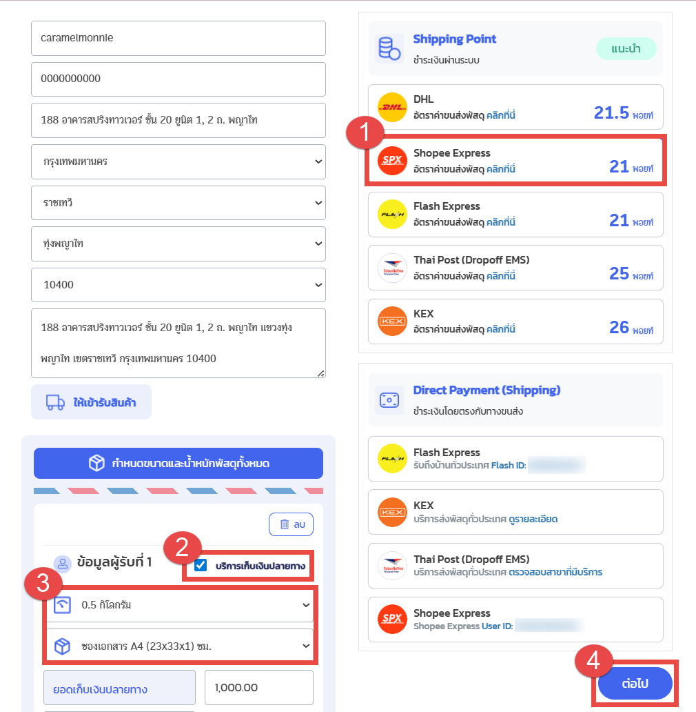 2. ติ๊กเลือก “บริการเก็บเงินปลายทาง”