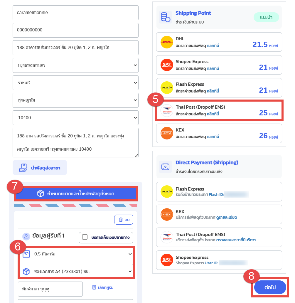 8. ตรวจสอบที่อยู่ผู้ส่ง – ผู้รับให้เรียบร้อย (โดยข้อมูลที่อยู่จะอ้างอิงตามขนส่ง Thai Post) จากนั้นกดปุ่ม “ต่อไป”